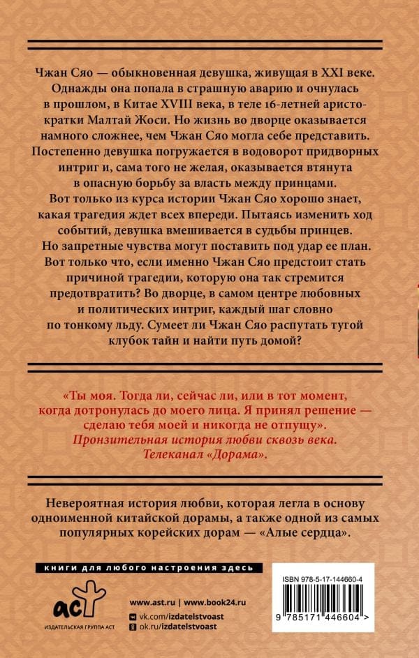 Чжан Сяо — обыкновенная девушка, живущая в XXI веке. Однажды она попала в страшную аварию и очнулась в прошлом, в Китае XVIII века, в теле 16 летней аристократки Малтай Жоси. Но жизнь во дворце оказывается намного сложнее, чем Чжан Сяо могла себе представить. Постепенно девушка погружается в водоворот придворных интриг и, сама того не желая, оказывается втянута в опасную борьбу за власть между принцами. Вот только из курса истории Чжан Сяо хорошо знает, какая трагедия ждет всех впереди. Пытаясь изменить ход событий, девушка вмешивается в судьбы принцев. Но запретные чувства могут поставить под удар ее план. Вот только что, если именно Чжан Сяо предстоит стать причиной трагедии, которую она так стремится предотвратить? Во дворце, в самом центре любовных и политических интриг, каждый шаг словно по тонкому льду. Сумеет ли Чжан Сяо распутать тугой клубок тайн и найти путь домой?