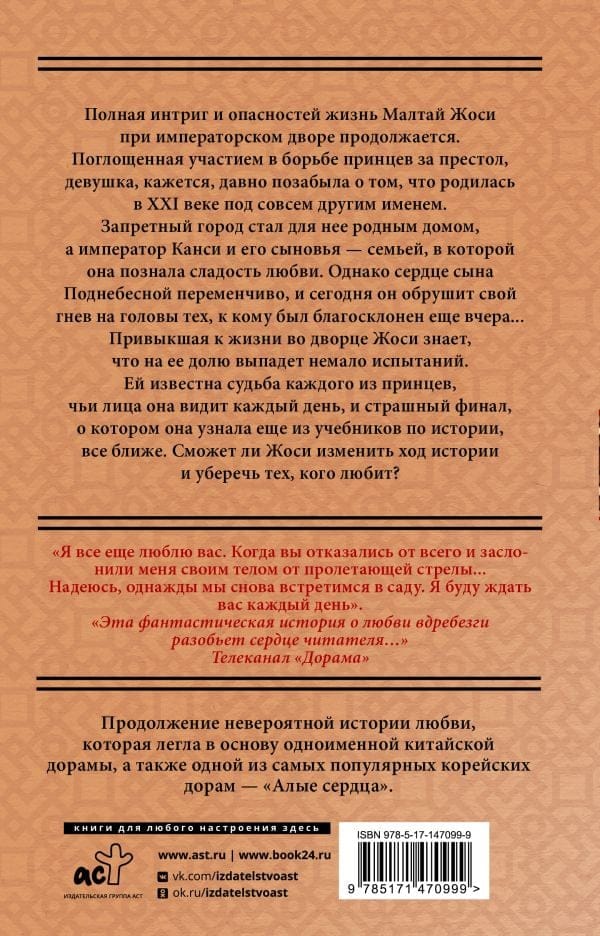 Полная интриг и опасностей жизнь Малтай Жоси при императорском дворе продолжается. Поглощенная участием в борьбе принцев за престол, девушка, кажется, давно позабыла о том, что родилась в XXI веке под совсем другим именем. Запретный город стал для нее родным домом, а император Канси и его сыновья — семьей, в которой она познала сладость любви. Однако сердце сына Поднебесной переменчиво, и сегодня он обрушит свой гнев на головы тех, к кому был благосклонен еще вчера...