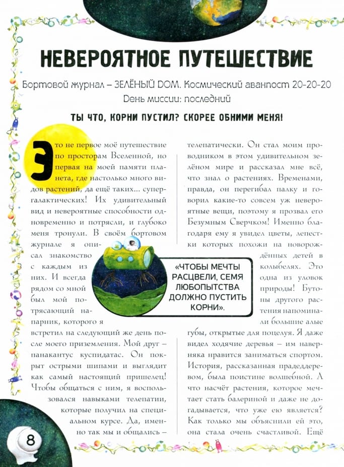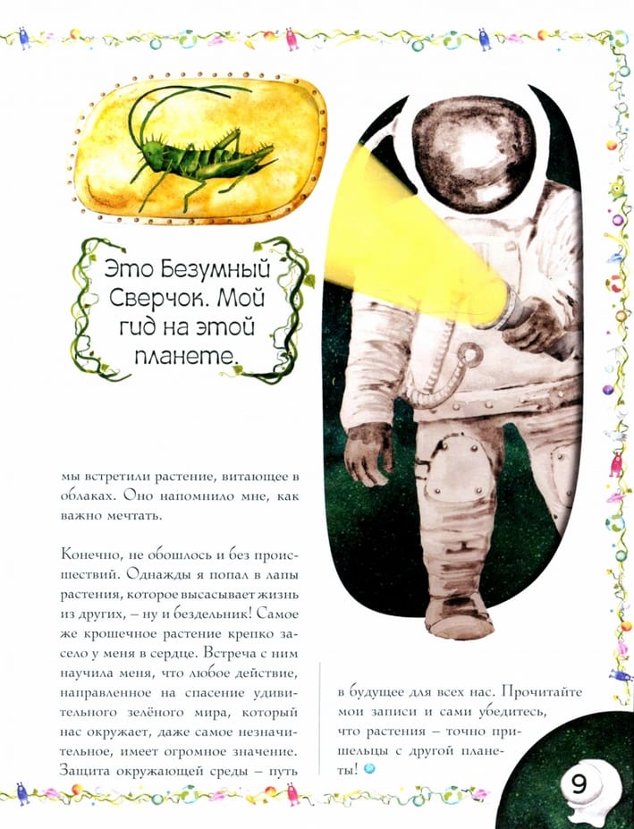 «Поразительные растения, которые выглядят как пришельцы» — это книга о невероятном мире растений, среди которых встречаются настолько поразительные экземпляры, что не верится, что они с Земли. Книга оформлена в виде бортового журнала космического исследователя. Он путешествует по планетам в далёком космосе и однажды прилетает на ту, что кажется ему особенно невероятной. Виды растений, которые встречаются ему во время исследования, он тщательно документирует, записывает их особенности и невероятные способности. А помогает ему в этом удивительное животное, которое сам он называет Безумным Сверчком. Но сверчок ли это? И в самом ли деле все изумительные растения, описанные им, существуют в действительности? Увлекательная и весёлая книга подарит читателям множество радостных минут, познакомит с миром растений и расскажет о том, как важно беречь планету. Для среднего школьного возраста.