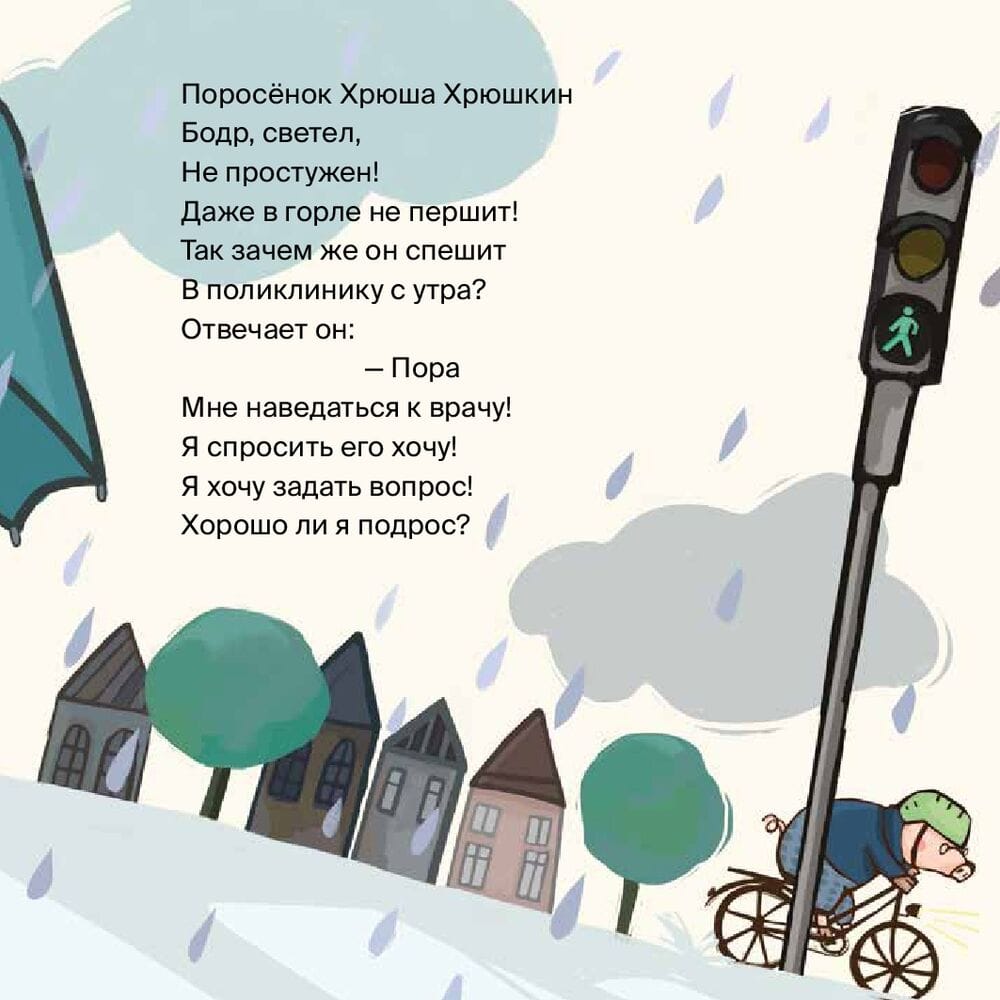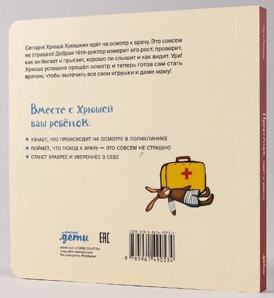 Сегодня Хрюша Хрюшкин идет на осмотр к врачу. Это совсем не страшно! Добрая тетя-доктор измерит его рост, проверит, как он бегает и прыгает, хорошо ли слышит и как видит. Ура! Хрюша успешно прошел осмотр и теперь готов сам стать врачом, чтобы вылечить все свои игрушки и даже маму!