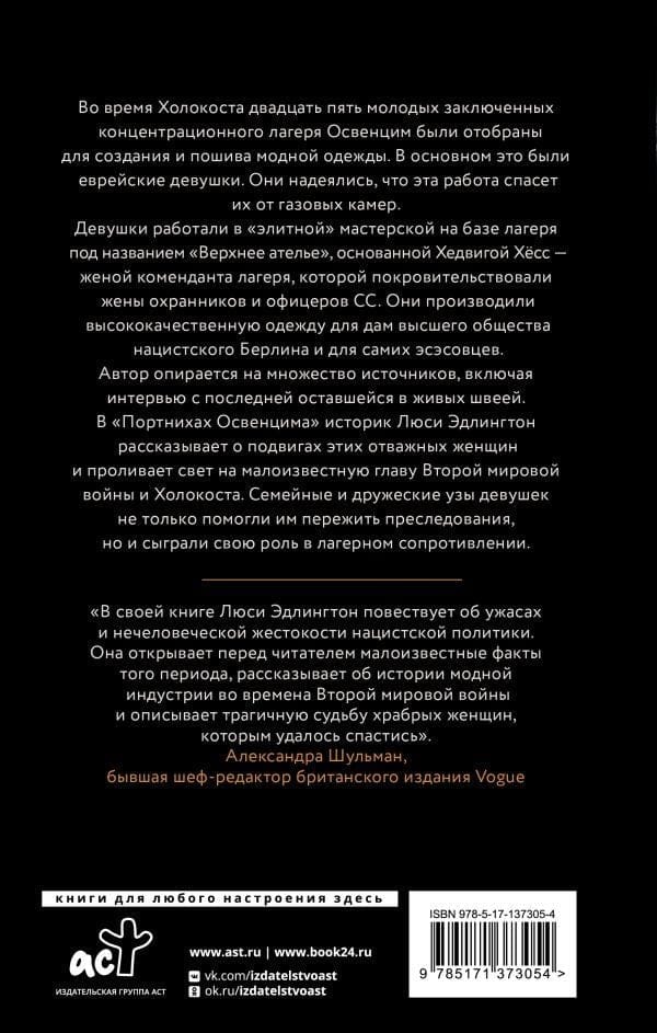 Во время Холокоста двадцать пять молодых заключенных концентрационного лагеря Освенцим были отобраны для создания и пошива модной одежды. В основном это были еврейские девушки. Они надеялись, что эта работа спасет их от газовых камер. Девушки работали в «элитной» мастерской на базе лагеря под названием «Верхнее ателье», основанной Хедвигой Хёсс — женой коменданта лагеря, которой покровительствовали жены охранников и офицеров СС. Они производили высококачественную одежду для дам высшего общества нацистского Берлина и для самих эсэсовцев. В «Портнихах Освенцима» историк Люси Эдлингтон рассказывает о подвигах этих отважных женщин и проливает свет на малоизвестную главу Второй мировой войны и Холокоста. Семейные и дружеские узы девушек не только помогли им пережить преследования, но и сыграли свою роль в лагерном сопротивлении. Автор опирается на множество источников, включая интервью с последней оставшейся в живых швеей.