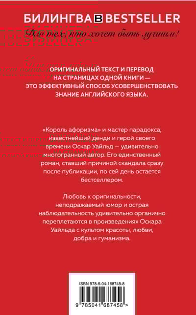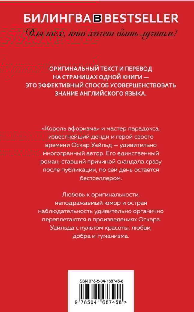 Для тех, кто хочет быть лучшим! Оригинальный текст и перевод на страницах одной книги — это эффективный способ усовершенствовать знание английского языка. «Король афоризма» и мастер парадокса, известнейший денди и герой своего времени Оскар Уайльд — удивительно многогранный автор. Его единственный роман, ставший причиной скандала сразу после публикации, по сей день остается бестселлером. Любовь к оригинальности, неподражаемый юмор и острая наблюдательность удивительно органично переплетаются в произведениях Оскара Уайльда с культом красоты, любви, добра и гуманизма.