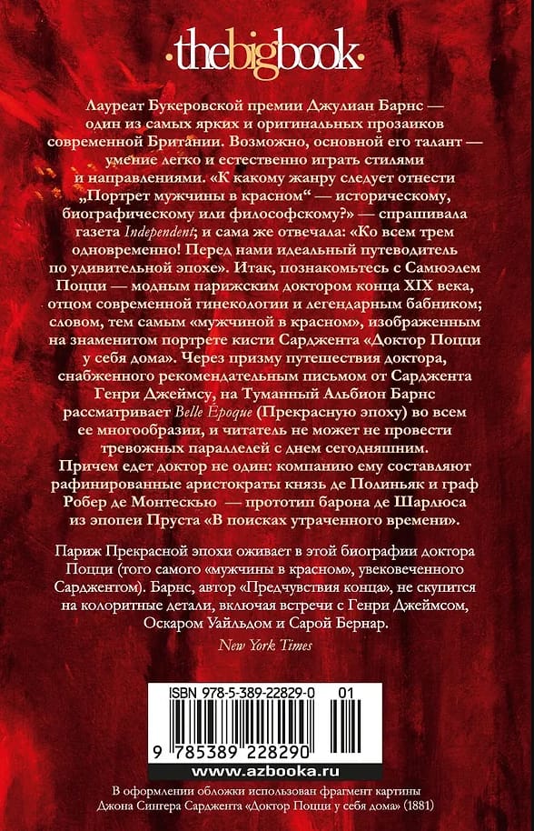 Лауреат Букеровской премии Джулиан Барнс — один из самых ярких и оригинальных прозаиков современной Британии, автор таких международных бестселлеров, как «Одна история», «Шум времени», «Предчувствие конца», «Артур и Джордж», «История мира в 10½ главах», «Попугай Флобера», «Элизабет Финч» и многих других. Возможно, основной его талант — умение легко и естественно играть стилями и направлениями. Тонкая стилизация и едкая ирония, утонченный лиризм и доходящий чуть ли не до цинизма сарказм, агрессивная жесткость и веселое озорство — Барнсу подвластно все это и многое другое. «К какому жанру следует отнести „Портрет мужчины в красном“ — историческому, биографическому или философскому?» — спрашивала газета Independent; и сама же отвечала: «Ко всем трем одновременно! Перед нами идеальный путеводитель по удивительной эпохе». Итак, познакомьтесь с Самюэлем Поцци — модным парижским доктором конца XIX века, отцом современной гинекологии и легендарным бабником; словом, тем самым «мужчиной в красном», изображенным на знаменитом портрете кисти Сарджента «Доктор Поцци у себя дома». Через призму путешествия доктора, снабженного рекомендательным письмом от Сарджента Генри Джеймсу, на Туманный Альбион Барнс рассматривает Belle Époque (Прекрасную эпоху) во всем ее многообразии, и читатель не может не провести тревожных параллелей с днем сегодняшним. Причем едет доктор не один: компанию ему составляют рафинированные аристократы князь де Полиньяк и граф Робер де Монтескью — прототип барона де Шарлюса из эпопеи Пруста «В поисках утраченного времени».