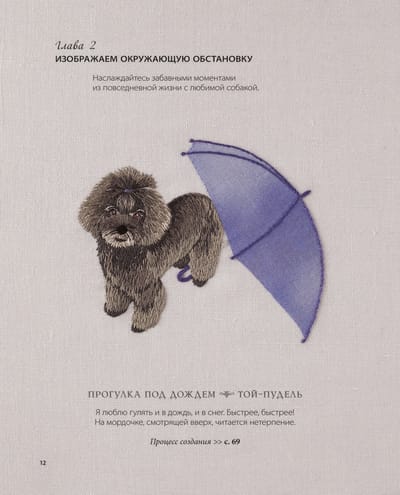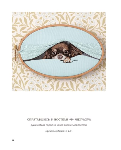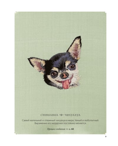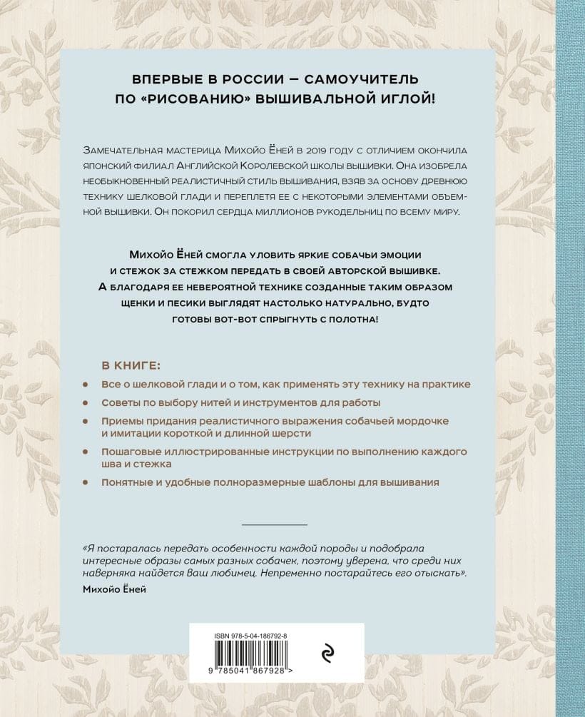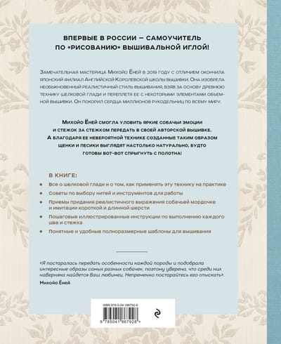 Умеете ли вы рисовать карандашами, красками или фломастерами? Вероятно, да. А умеете ли вы «рисовать» иглой? Если нет, вас этому с легкостью научит выпускница Английской Королевской школы вышивки Михойо Ёней! Собаки издревле были в почете в Стране Восходящего Солнца. Их по праву называют лучшими друзьями человека. Хоть и не напрямую, но собаки все же способны передавать свои мысли, чувства и потребности с помощью мимики и поведения, общаясь со своим хозяином. Четвероногим любимцам посвящали литературные произведения, ставили памятники и изображали на картинах, в том числе вышитых! Знаменитая японская мастерица Михойо Ёней взяла за основу своих работ древнюю технику вышивания шелковой гладью и решила переплести ее с элементами объемной вышивки. Щеночки и песики, рождающиеся на полотне Михойо, получаются настолько реалистичными, будто вот-вот прыгнут к вам в объятия. 32 реалистичных дизайна вышивок, посвященные всем любителям собак. • Всё о шелковой глади и том, как применять эту технику на практике. • Советы по выбору нитей и инструментов для работы. • Приемы придания реалистичного выражения собачьей мордочке и имитации короткой и длинной шерсти. • Пошаговые иллюстрированные инструкции по выполнению каждого шва и стежка. • Понятные и удобные полноразмерные шаблоны для вышивания.