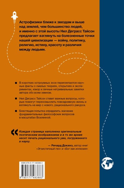 Как астрофизик, то есть человек, который ближе к звездам и выше над землей, чем мы все, Нил Деграсс Тайсон предлагает сверху взглянуть на болезненные точки нашей цивилизации — войну, политику, религию, истину, красоту и различия между людьми, — чтобы острее почувствовать наше единство.