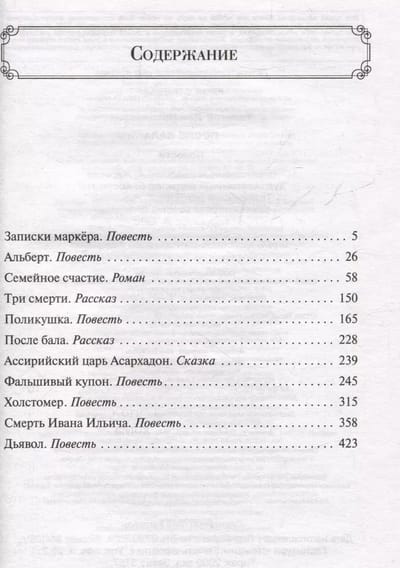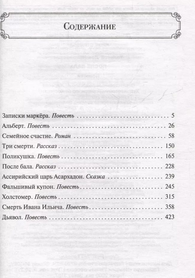 В сборник вошли произведения Льва Николаевича Толстого (1828—1910), написанные им в зрелом возрасте: роман «Семейное счастие», повести «Альберт», «Смерть Ивана Ильича», «Поликушка», «Дьявол», «Фальшивый купон», «Холстомер»; рассказы «Записки маркёра» и «После бала»; сказка «Ассирийский царь Асархадон»; притча «Три сына».