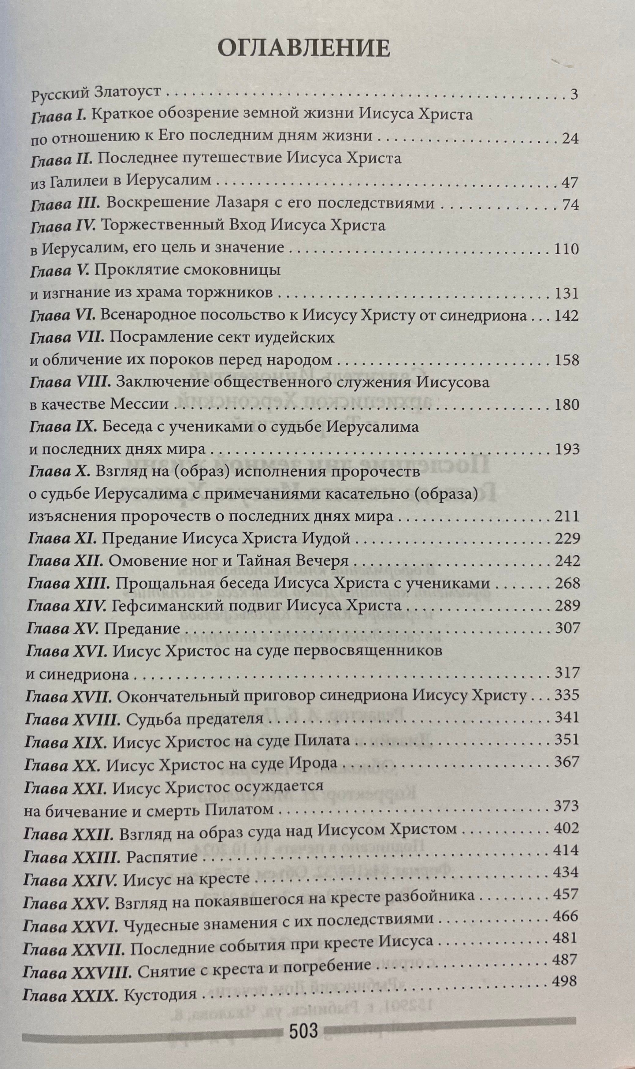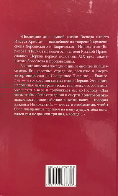Последние дни земной жизни Господа нашего Иисуса Христа важнейшее из творений архиепископа Херсонского и Таврического Иннокентия (Борисова; 1857), выдающегося деятеля Русской Православной Церкви первой половины XIX века, знаменитого богослова и проповедника. Эта работа была написана святителем Иннокентием в период его служения в Петербурге, когда ему не было еще и тридцати лет. За этот труд он был удостоен степени доктора богословия. Святитель, описывая последние дни земной жизни Спасителя, Его крестные страдания, распятие и смерть, опирается на Священное Писание Евангелие и толкования святых отцов Церкви. Эта книга, напоминая нам о трагических евангельских событиях, укрепляет в вере и приближает нас ко Господу. Для того, чтобы образ страданий и смерти Христовой оказывал постоянное действие на жизнь нашу, говорил владыка Иннокентий, для сего необходимо, чтобы Он с плащаницы перешел на нашу душу, чтобы оставался там не два или три дня, а всегда... . Данное издание может служить практическим пособием для всех углубленно изучающих Евангелие.
