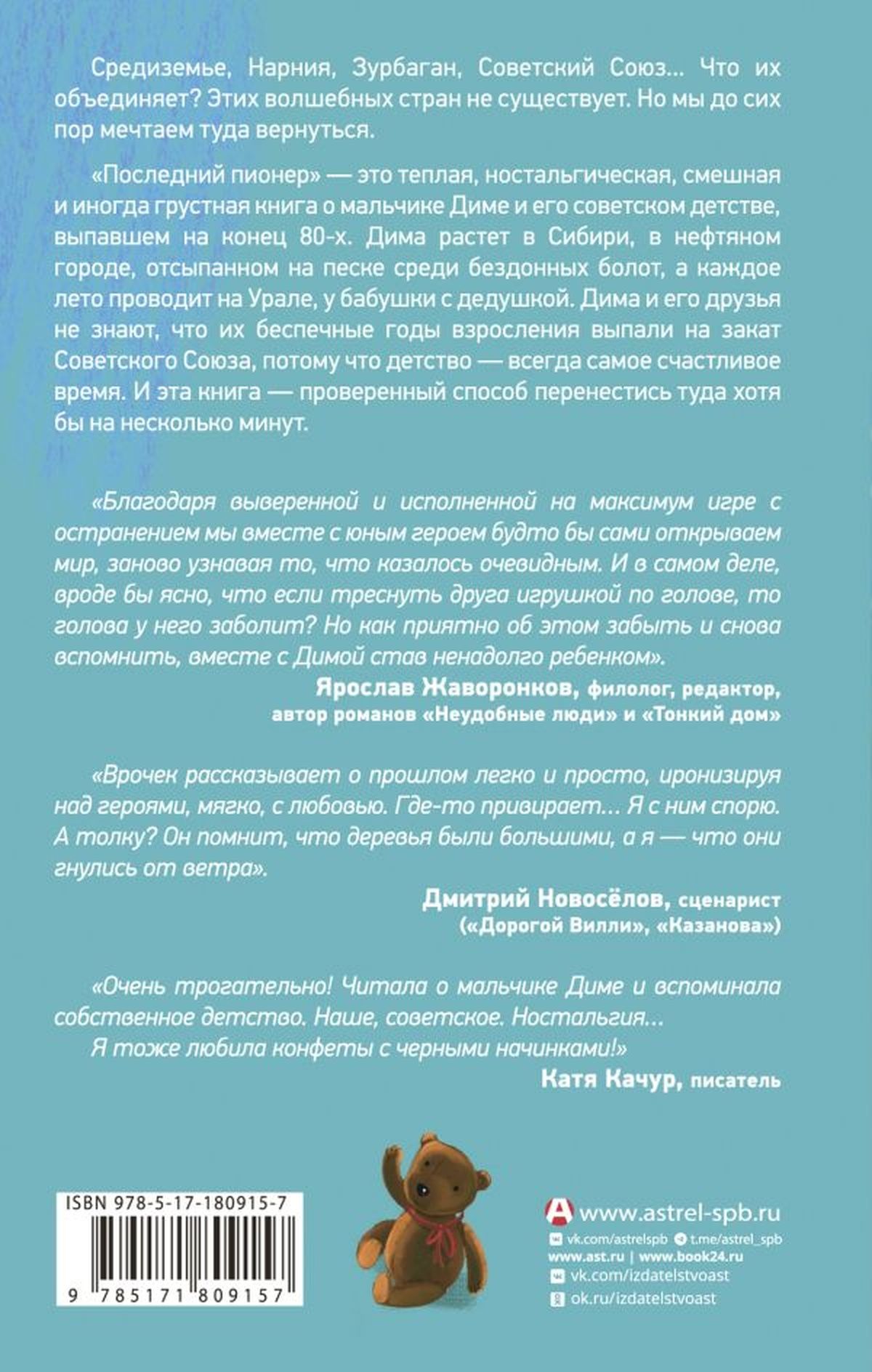 «Последний пионер» — это теплая, ностальгическая, смешная и иногда грустная книга о мальчике Диме и его советском детстве, выпавшем на конец 80-х. Дима растет в Сибири, в нефтяном городе, отсыпанном на песке среди бездонных болот, а каждое лето проводит на Урале, у бабушки с дедушкой. Дима и его друзья не знают, что их беспечные годы взросления выпали на закат Советского Союза, потому что детство — всегда самое счастливое время. И эта книга — проверенный способ перенестись туда хотя бы на несколько минут.
