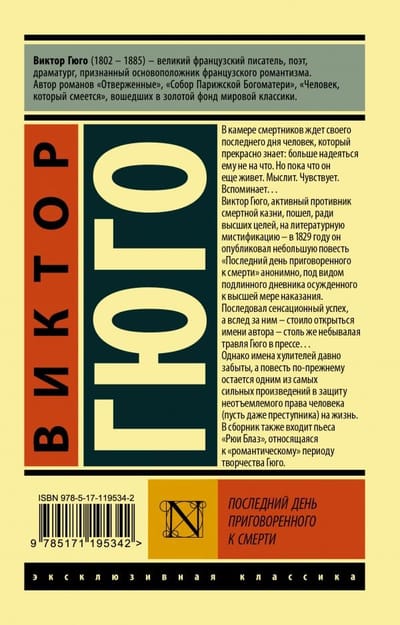 В камере смертников ждет своего последнего дня человек, который прекрасно знает: больше надеяться ему не на что. Но пока что он еще живет. Мыслит. Чувствует. Вспоминает… Виктор Гюго, активный противник смертной казни, пошел, ради высших целей, на литературную мистификацию - в 1829 году он опубликовал небольшую повесть "Последний день приговоренного к смерти" анонимно, под видом подлинного дневника осужденного к высшей мере наказания. Последовал сенсационный успех, а вслед за ним - стоило открыться имени автора, - столь же небывалая травля Гюго в прессе… Однако имена хулителей давно забыты, а повесть по-прежнему остается одним из самых сильных произведений в защиту неотъемлемого права человека (пусть даже преступника) на жизнь. В сборник также входит пьеса "Рюи Блаз", относящаяся к "романтическому" периоду творчества Гюго.