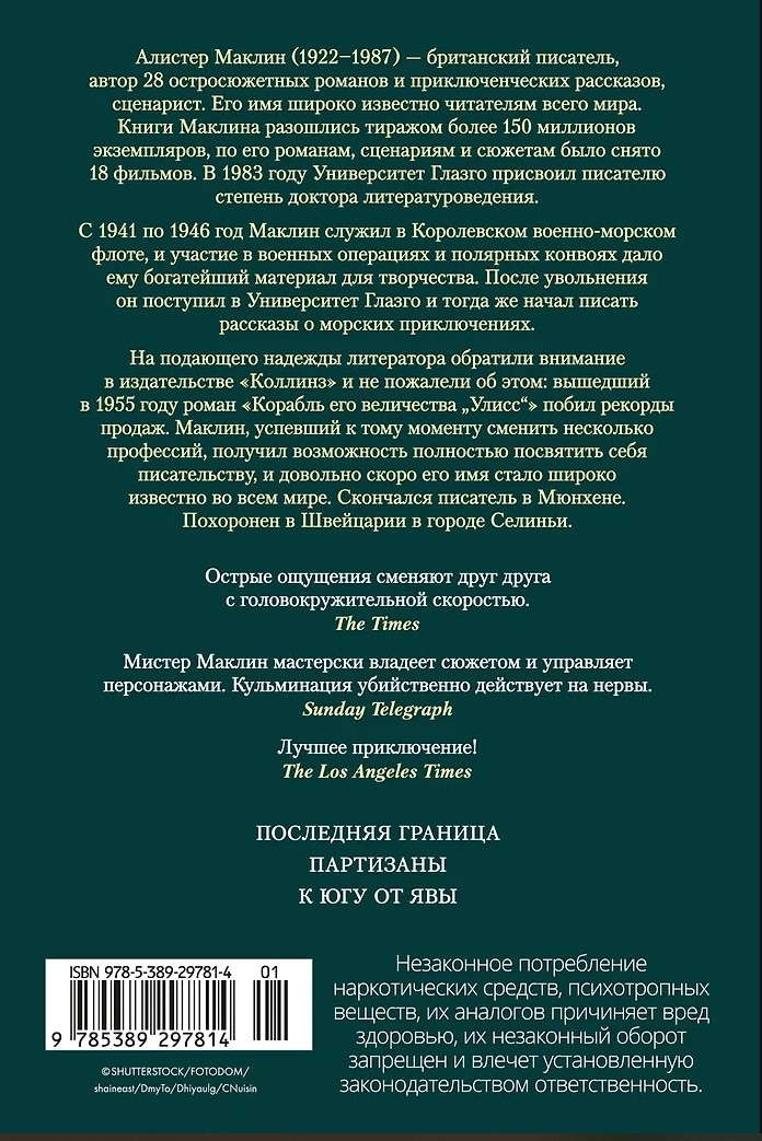 Алистер Маклин (1922–1987) — британский писатель, автор 28 остросюжетных романов и приключенческих рассказов, сценарист. Его имя широко известно читателям всего мира. Книги Маклина разошлись тиражом более 150 миллионов экземпляров, по его романам, сценариям и сюжетам было снято 18 фильмов. В 1983 году Университет Глазго присвоил писателю степень доктора литературоведения.