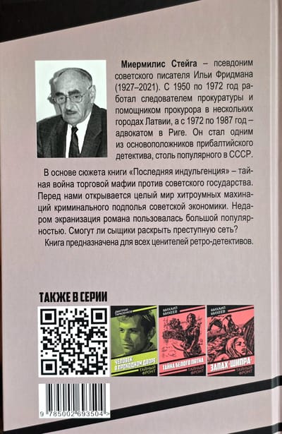 Миермилис Стейга – псевдоним советского писателя Ильи Фридмана (1927–2021). Автор с 1950 по 1972 год работал следователем прокуратуры и помощником прокурора в нескольких городах Латвии, а с 1972 по 1987 год – адвокатом в Риге. За время работы в органах Илья Фридман стал одним из основоположников прибалтийского детектива, столь популярного в СССР. В основе сюжета книги «Последняя индульгенция» – тайная война торговой мафии против советского государства. Перед нами открывается целый мир хитроумных махинаций криминального подполья советской экономики. Недаром экранизация романа пользовалась большой популярностью. Смогут ли сыщики раскрыть преступную сеть? Книга предназначена для всех ценителей ретро-детективов.