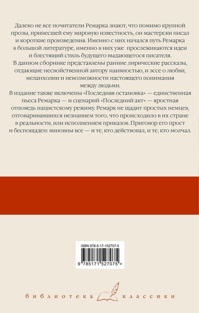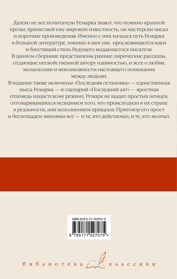Далеко не все почитатели Ремарка знают, что помимо крупной прозы, принесшей ему мировую известность, он мастерски писал и короткие произведения. Именно с них начался путь Ремарка в большой литературе, именно в них уже прослеживаются идеи и блестящий стиль будущего выдающегося писателя. В данном сборнике представлены ранние лирические рассказы, отдающие несвойственной автору наивностью, и эссе о любви, меланхолии и невозможности настоящего понимания между людьми. В издание также включены «Последняя остановка» — единственная пьеса Ремарка, а также сценарий «Последний акт» — яростная отповедь нацистскому режиму. Ремарк не щадит простых немцев, отговаривавшихся незнанием того, что происходило в их стране в реальности, или исполнением приказов. Приговор его прост и беспощаден: виновны все — и те, кто действовал, и те, кто молчал.
