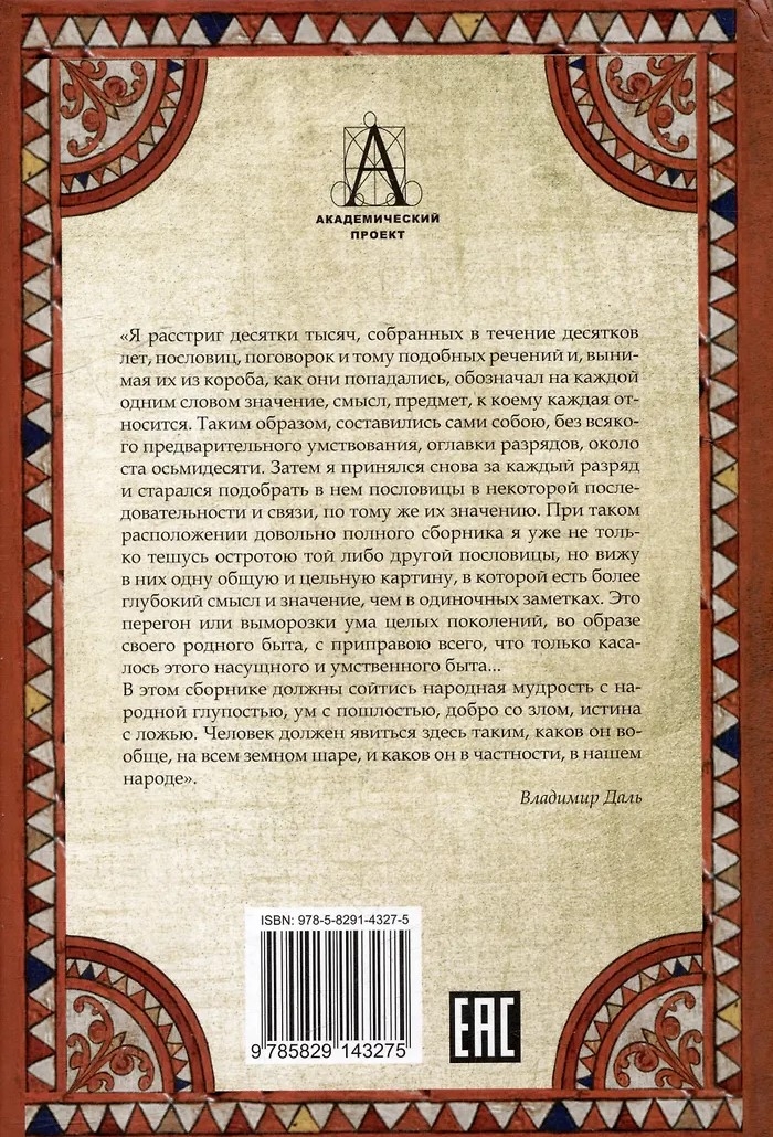 Великий русский ученый, врач, естествоиспытатель, писатель и лексикограф Владимир Иванович Даль, главным трудом которого является «Толковый словарь живого великорусского языка», годы своей жизни посвятил сбору пословиц и поговорок русского народа. Книга стала одной из самых знаменитых работ русского этнографа и писателя, выдающимся произведением не только отечественной, но и мировой фольклористики. В труде содержится более тридцати тысяч поговорок, загадок и пословиц.