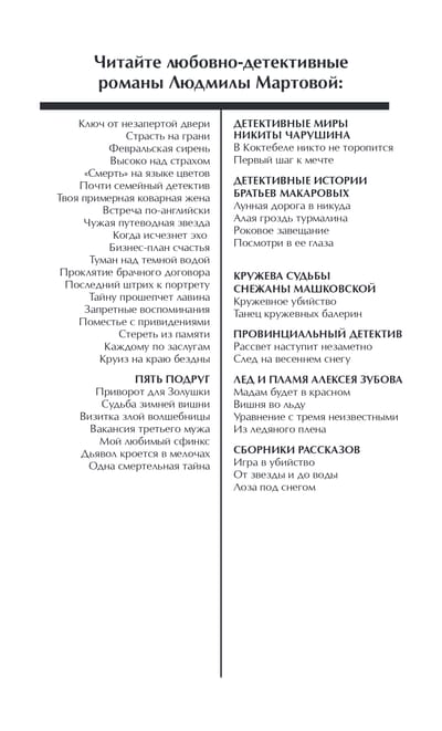 У Людмилы Мартовой легкий стиль, но при этом нелегковесное содержание. Ее детективные романы из серии «Желание женщины» дарят надежду. Их героини на своем примере показывают: если много сделать сегодня, то завтра все обязательно получится. А еще они учат ничего не бояться, ведь если посмотреть своим страхам в лицо, то с ними будет гораздо легче бороться!