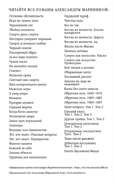 В этом романе Александра Маринина остаётся верна себе — точная психология, острое социальное чутьё и цепкий детективный нерв. Однако автор впервые вплетает в повествование сюжетную линию из будущего. Благодаря этому можно взглянуть на преступление так, как его увидят через десятки лет, когда правда уже никому не нужна.