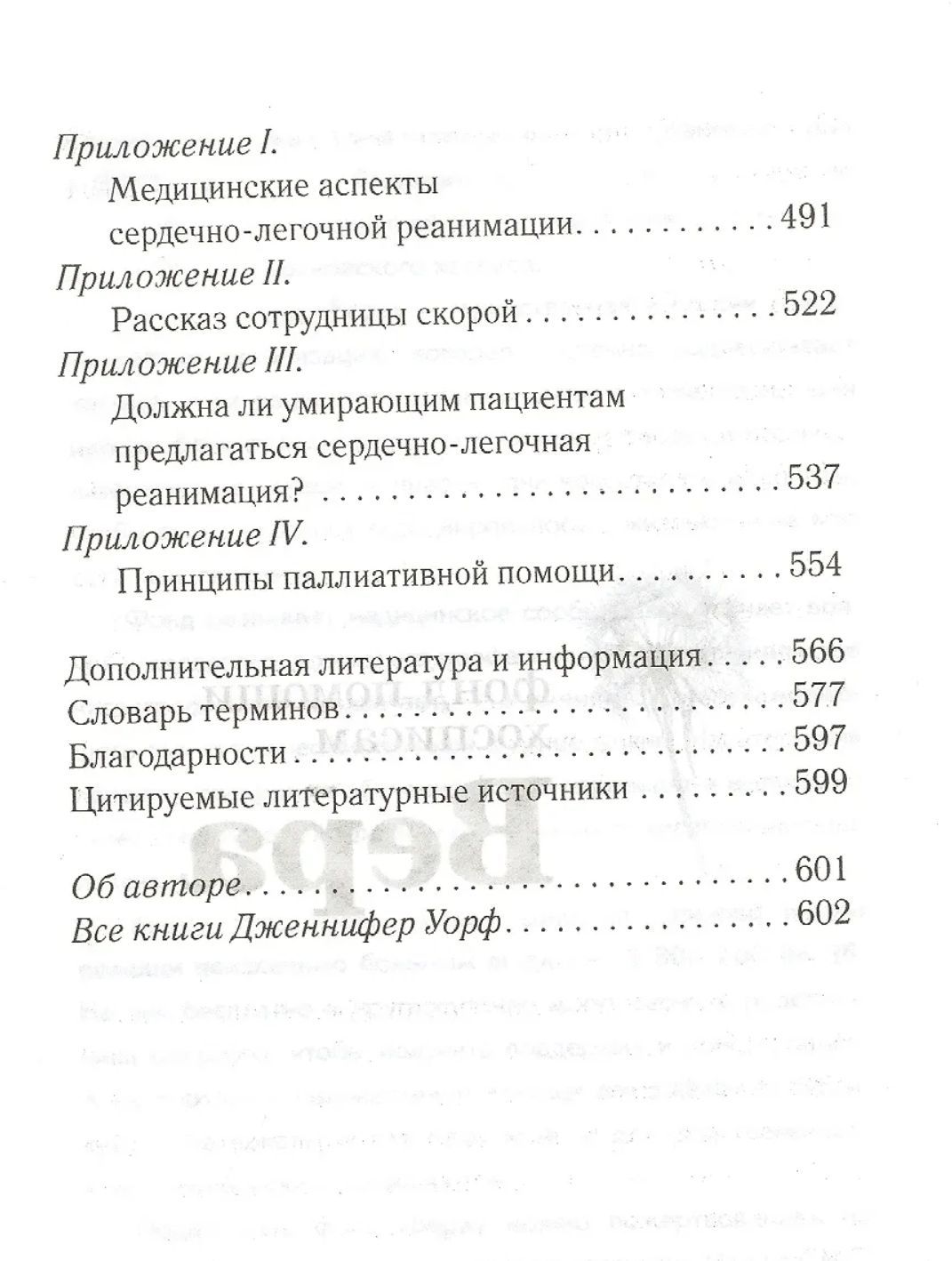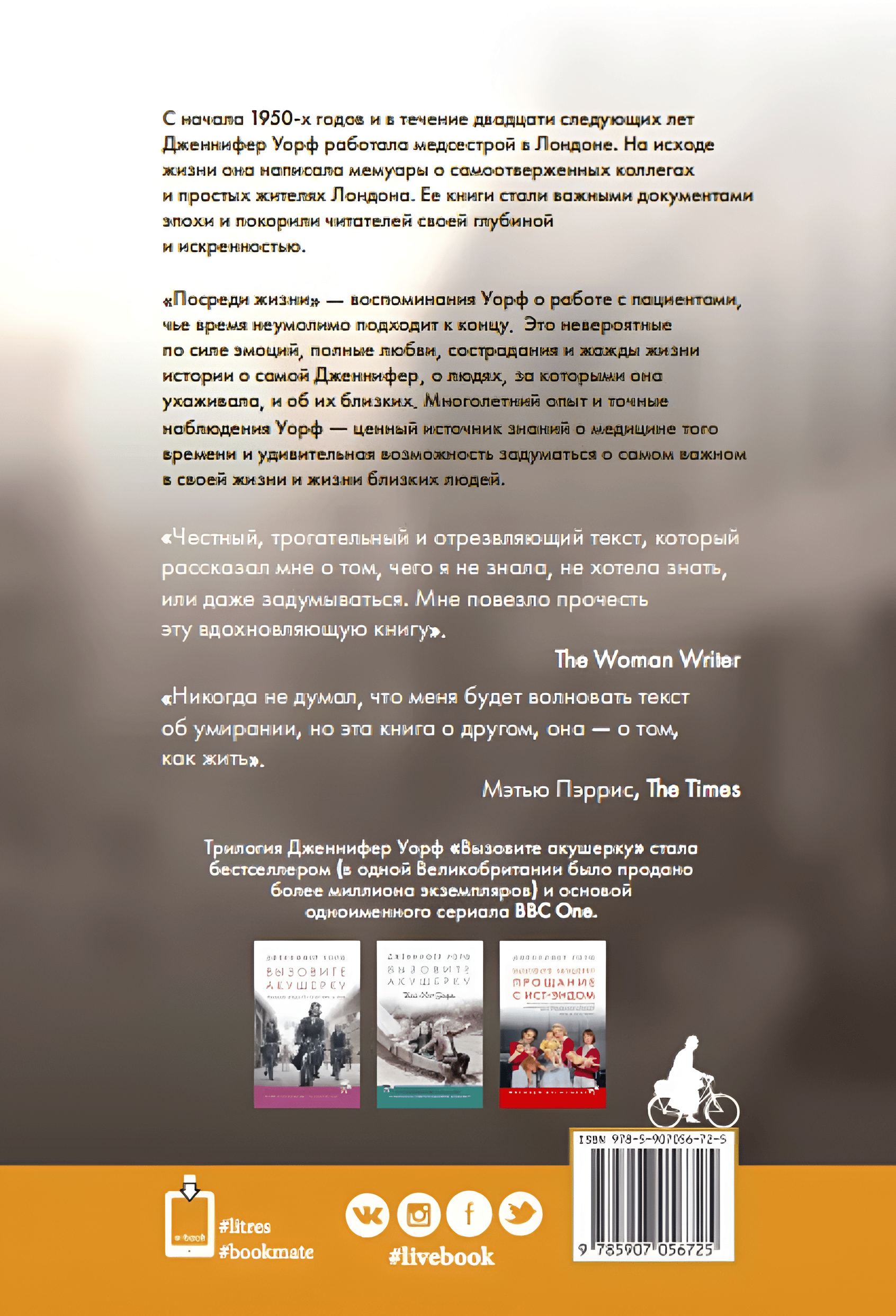 «Посреди жизни» — воспоминания Уорф о работе с пациентами, чье время неумолимо подходит к концу. Это невероятные по силе эмоций, полные любви, сострадания и жажды жизни истории о самой Дженнифер, о людях, за которыми она ухаживала, и об их близких. Многолетний опыт и точные наблюдения Уорф — ценный источник знаний о медицине того времени и удивительная возможность задуматься о самом важном в своей жизни и жизни близких людей.