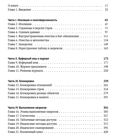 В книге рассматривается внутреннее устройство СУБД PostgreSQL: детали реализации многоверсионности и изоляции на основе снимков данных, включая процедуру очистки неактуальных версий строк; буферный кеш и журнал предзаписи; использование блокировок различных уровней; планирование и выполнение SQL-запросов; принципы расширяемости и особенности имеющихся индексных методов доступа. Большое внимание уделяется возможностям, предоставляемым для самостоятельного изучения механизмов функционирования PostgreSQL.