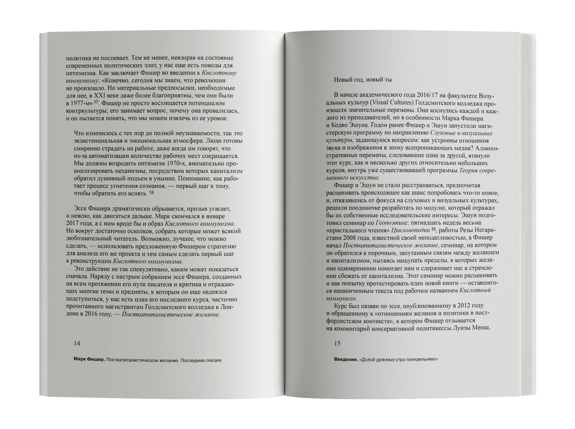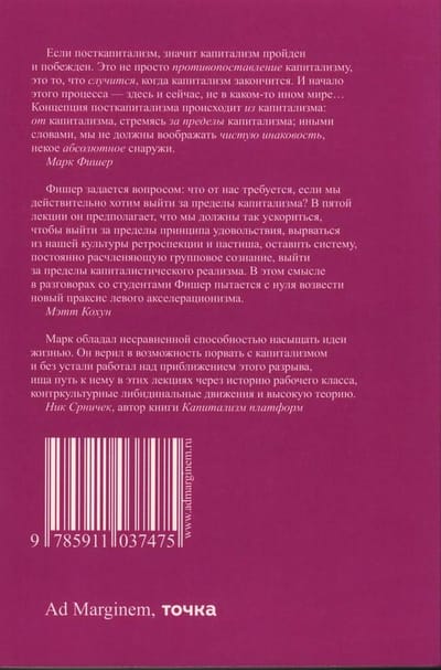 Сборник заключительной серии лекций британского философа, теоретика культуры, издателя и активиста Марка Фишера (1968-2017), прочитанной им в Голдсмит-колледже Лондонского университета в 2016 году. Начиная с самого фундаментального из вопросов «Действительно ли мы хотим того, о чем говорим?», Фишер исследует взаимосвязь между желанием и капитализмом и пытается понять, какие новые формы желания мы все еще могли бы извлечь из прошлого, настоящего и будущего. От возникновения и провала контркультуры в 1970-х годах до дальнейшего развития его левого акселерационистского направления мышления, эта книга представляет собой трагически прерванный курс размышлений о воспитании нового типа сознания и его культурных последствиях.