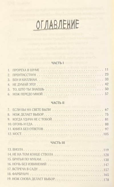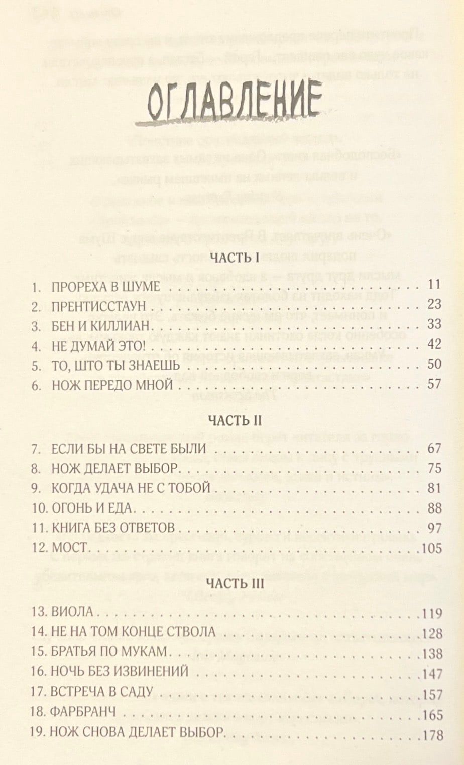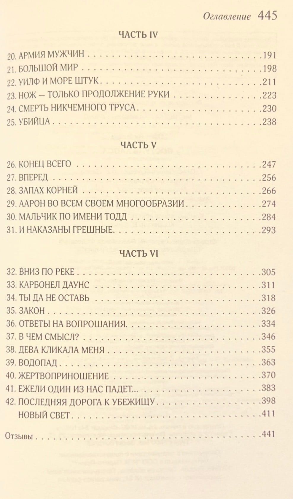 Планета Новый свет могла стать раем для тех, кто не нашел счастья в старом мире. Но все надежды разрушил неизвестный вирус. Среди поселенцев не осталось ни одной женщины, а уцелевшие мужчины начали слышать мысли друг друга. Так появился Шум, который был наполнен мыслями и воспоминаниями каждого человека. Тодд Хьюитт — единственный подросток в единственном на планете городе Прентисстаун. Однажды Тодд находит место абсолютной тишины, где неожиданно встречает Виолу. Как ей удалось выжить и почему вокруг нее тишина? В поисках правды о Новом свете Тодд вынужден бежать вместе с Виолой и преданным псом Манчи. Но как спастись от погони, когда преследователи слышат каждую мысль?