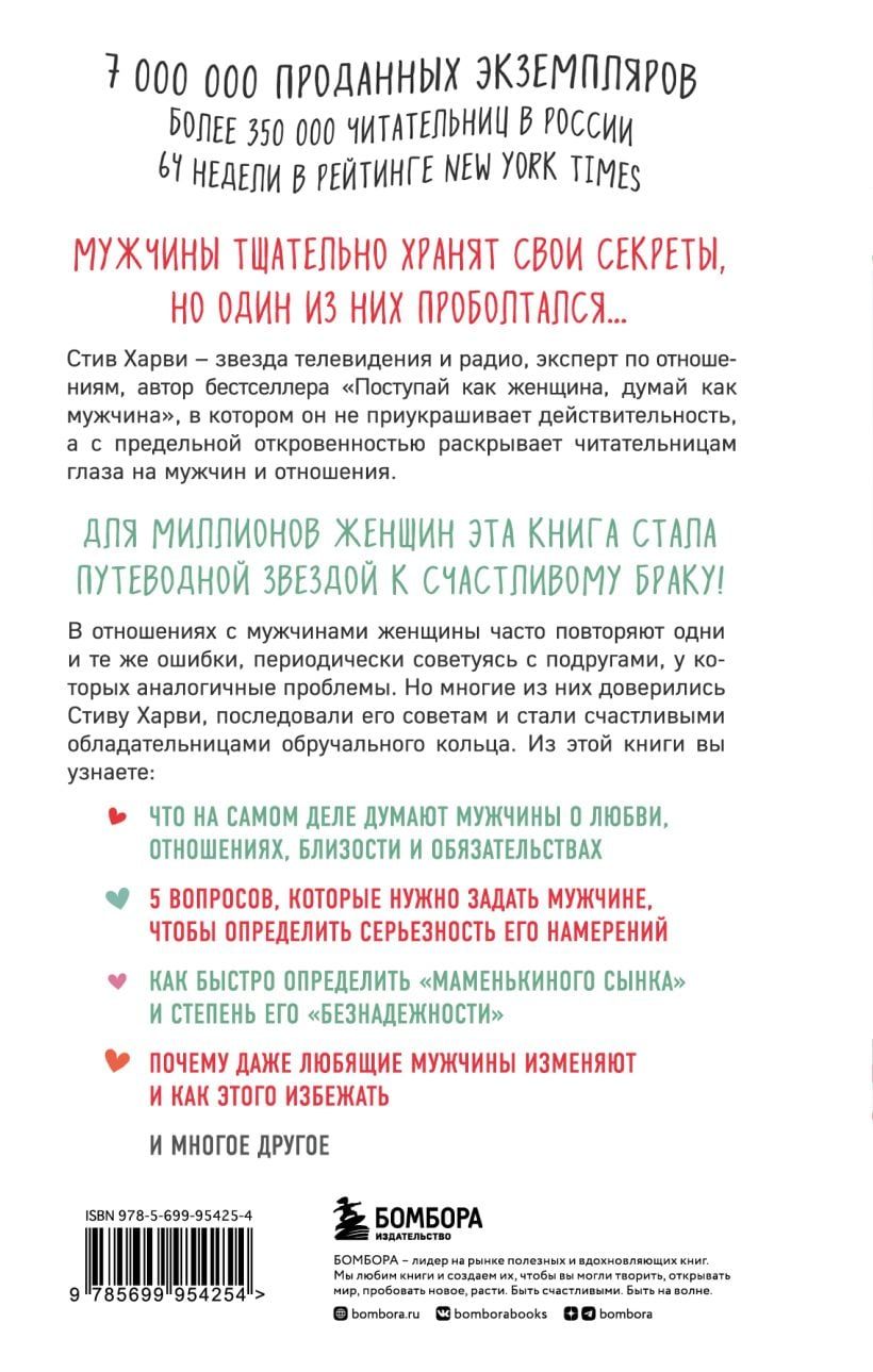 Миллионы женщин по всему миру доверилисьв этом вопросе Стиву Харви, знаменитому радиоведущему суперпопулярного в США "Утреннего шоу Стива Харви". В своей книге, ставшей бестселлером не только в Америке, но и в России, он помогает читательницам понять ход мыслей представителей сильного пола и отвечает на множество наболевших вопросов. Например, таких: "Что вы должны, а что не можете требовать от своего мужчины?", "Как распознать маменькиного сыночка, и что делать в этом случае?", "Когда знакомить кавалера со своими детьми?", "Какие пять вопросов нужно задать мужчине, чтобы определить серьезность его намерений?"