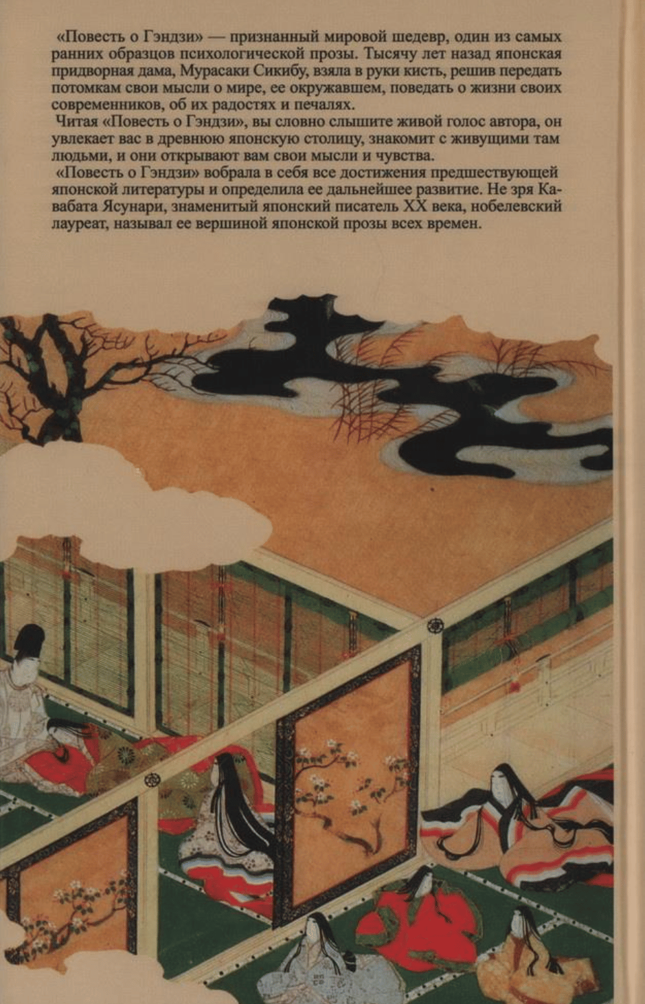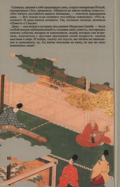 «Повесть о Гэндзи» («Гэндзи моногатари») — величайший памятник японской и мировой литературы. Он был создан на рубеже X-XI веков, в эпоху Хэйан, в период становления и бурного расцвета японской культуры. Автор этой книги — придворная дама, известная под именем Мурасаки Сикибу. Роман состоит из 54 свитков-глав. «Повесть о Гэндзи» была создана в ту замечательную эпоху, когда закладывались основы национальной японской культуры, происходило становление и бурное развитие всех литературных жанров.