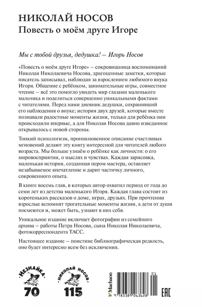 «Повесть о моём друге Игоре» - сокровищница воспоминаний Николая Николаевича Носова, драгоценные заметки, которые писатель записывал, наблюдая за взрослением любимого внука Игоря. Общение с ребёнком, занимательные игры, совместное чтение – всё это помогло увидеть мир глазами маленького мальчика и поделиться совершенно уникальными фактами с читателями. Перед нами дневник дедушки, сохранивший его наблюдения о внуке; история двух друзей, которые вместе познавали радостные моменты жизни, только для ребёнка они происходили впервые, а для Николая Носова давно изведанное открывалось с новой стороны.