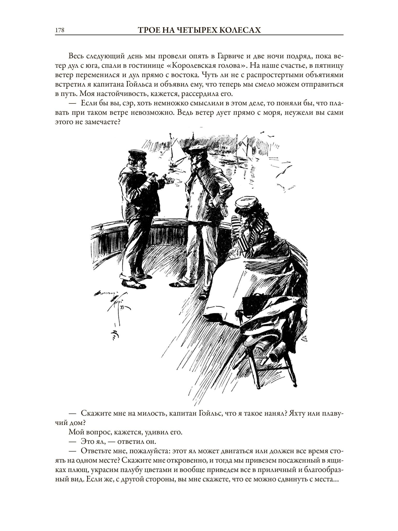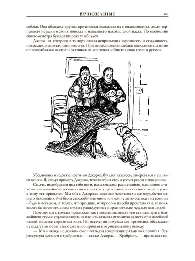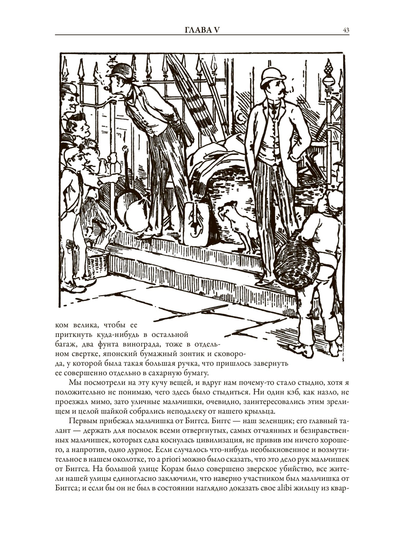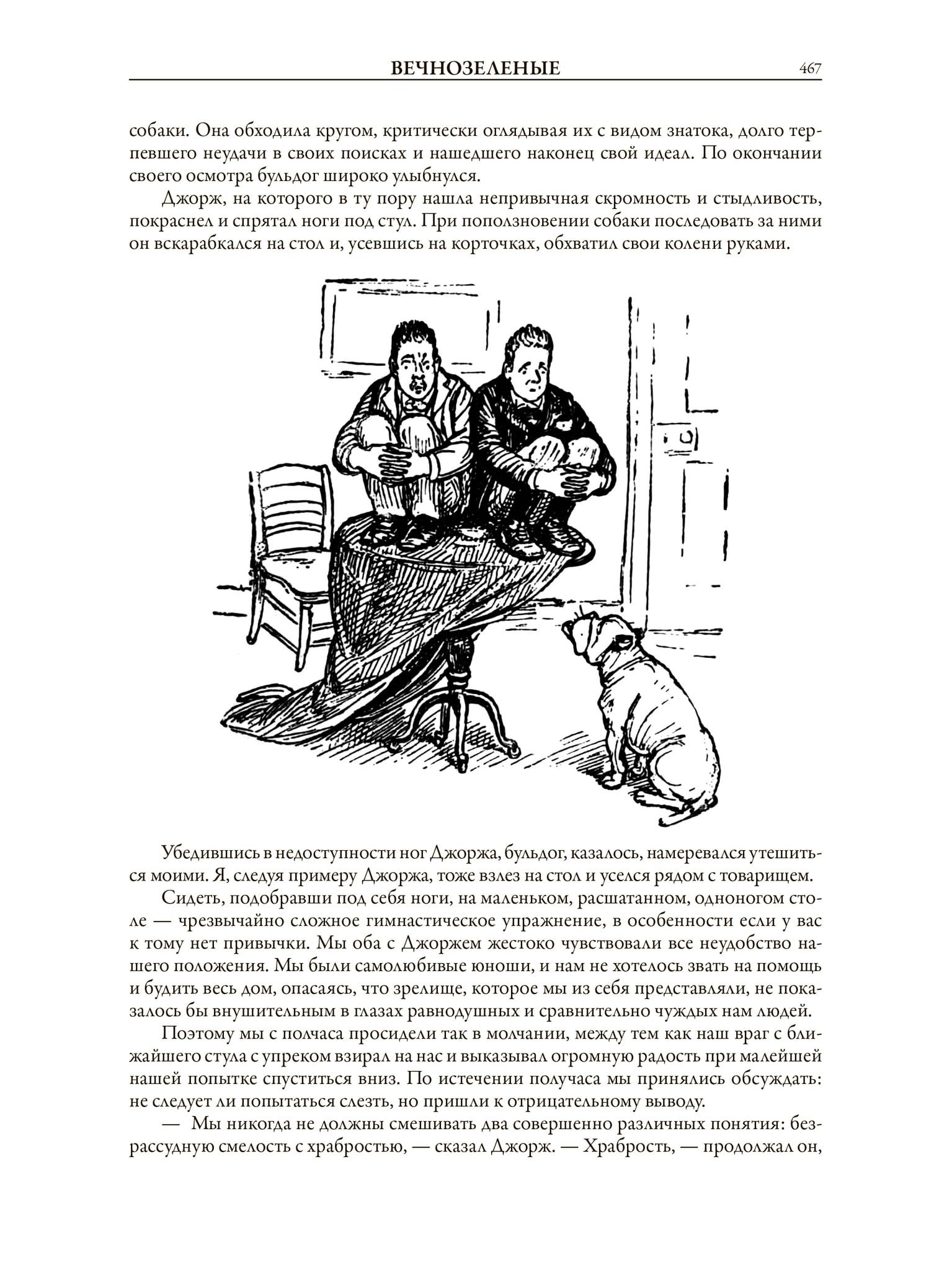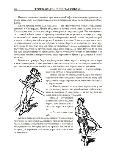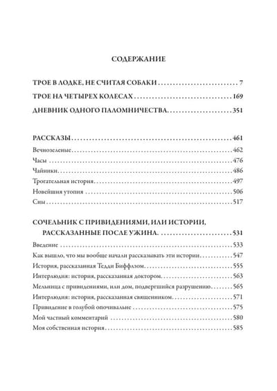 В сборник всемирно известного английского юмориста Джерома Клапки Джерома вошли шесть рассказов и три повести: «Трое в лодке, не считая собаки», «Трое на четырех колесах», «Дневник одного паломничества»; иллюстрации к ним выполнены двумя художниками — французом Огюстом Бену и англичанином Артуром Фредриксом, а также своеобразная пародия на святочные рассказы — «Сочельник с привидениями, или Истории, рассказанные после ужина». Это сочинение Джерома проиллюстрировано английским художником Кеннетом Мэтисоном Скипингом.