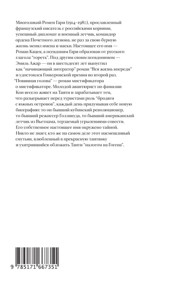 Ромен Гари (1914–1980) — знаменитый французский классик с российскими корнями. Настоящее его имя — Роман Кацев, а псевдоним Гари происходит от русского глагола «‎гореть»‎. Под другим своим псевдонимом — Эмиль Ажар — он стал единственным в истории лауреатом второй Гонкуровской премии.