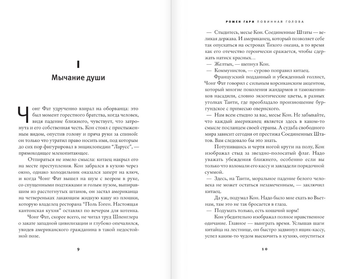 «‎Повинная голова»‎ — роман мистификатора о мистификаторе. Молодой красивый оборванец без роду и племени живет в хижине на Таити с прекрасной таитянкой и выдает себя то за художника, то за прокаженного, выкачивая деньги из богатых туристов. Подлинное его имя окружено тайной. Все только гадают, почему, пытаясь порвать с цивилизацией и ускользнуть от самого себя, он сбежал на этот остров, который ловко сумел обложить «‎налогом на Гогена»‎.