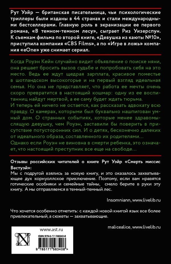 Когда Роуэн Кейн случайно видит объявление о поиске няни, она решает бросить вызов судьбе и попробовать себя на это место. Ведь ее ждут щедрая зарплата, красивое поместье в шотландском высокогорье и на первый взгляд идеальная семья. Но она не представляет, что работа ее мечты очень скоро превратится в настоящий кошмар: одну из ее воспитанниц найдут мертвой, а ее саму будет ждать тюрьма.И теперь ей ничего не остается, как рассказать адвокату всю правду. О камерах, которыми был буквально нашпигован умный дом. О странных событиях, которые менее здравомыслящую девушку, чем Роуэн, заставили бы поверить в присутствие потусторонних сил. И о детях, бесконечно далеких от идеального образа, составленного их родителями…Однако если Роуэн невиновна в смерти ребенка, это означает, что настоящий преступник все еще на свободе…