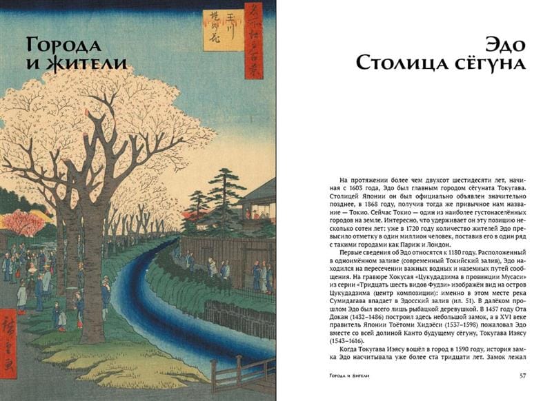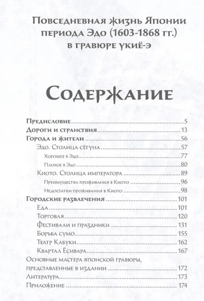 Книга посвящена повседневной жизни Японии, отображенной в традиционной гравюре укиё-э. Городская планировка, торговля и развлечения, религиозные фестивали и праздники, еда и образование — издание рассказывает о различных аспектах жизни японского общества. Гравюры позволяют расширить знания об устройстве крупнейших городов Японии, о бытовых условиях жизни японцев, о развлечениях и в целом о вещах и явлениях, которые были обычными, само собой разумеющимися для городских жителей. Авторы гравюр — знаменитейшие художники периода Эдо.