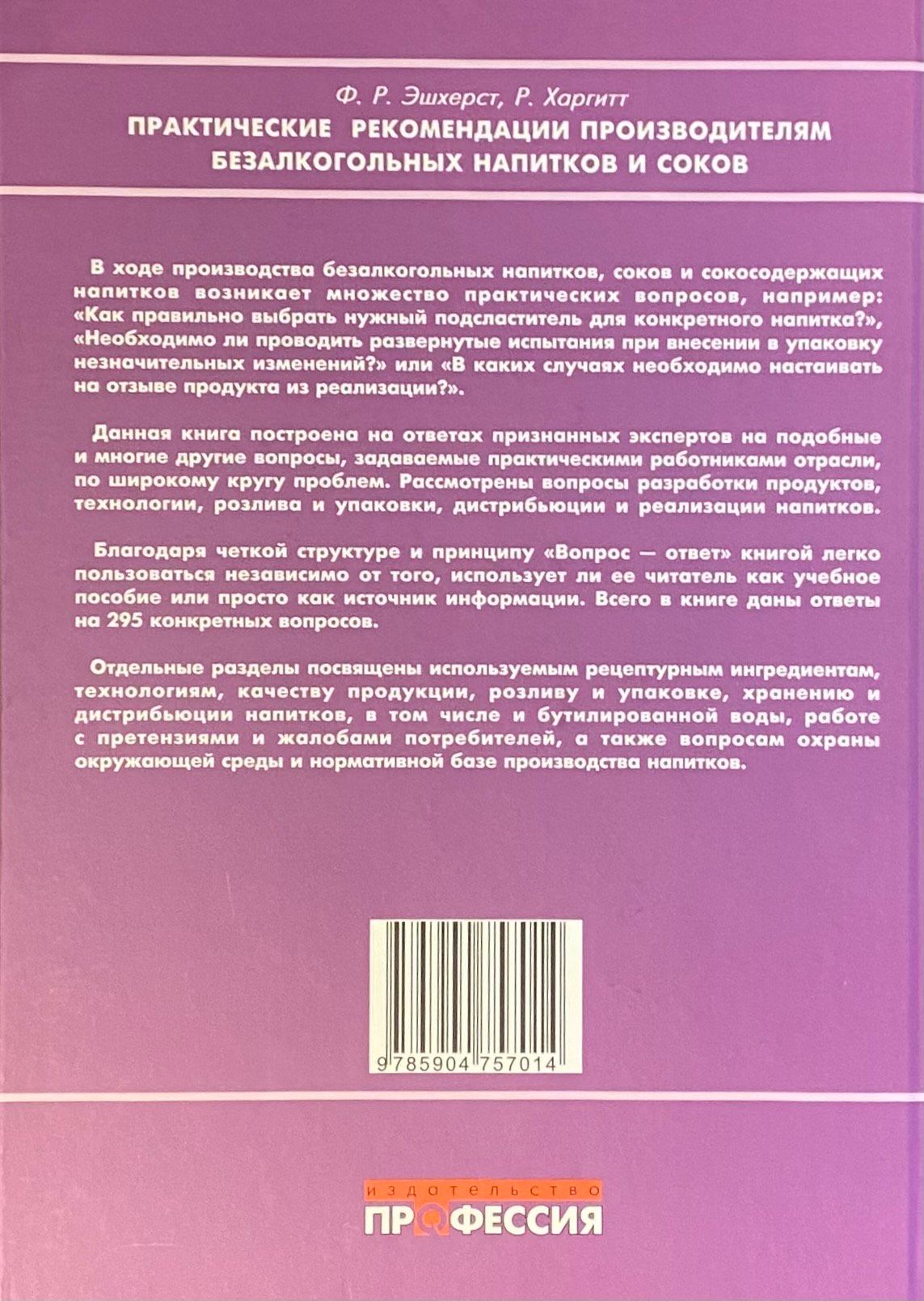 Данная книга построена на ответах признанных экспертов на подобные и многие другие вопросы, задаваемые практическими работниками отрасли, по широкому кругу проблем. Рассмотрены вопросы разработки продуктов, технологии, розлива и упаковки, дистрибьюции и реализации напитков. Благодаря четкой структуре и принципу «Вопрос — ответ» книгой легко пользоваться независимо от того, использует ли ее читатель как учебное пособие или просто как источник информации. Всего в книге даны ответы на 295 конкретных вопросов.