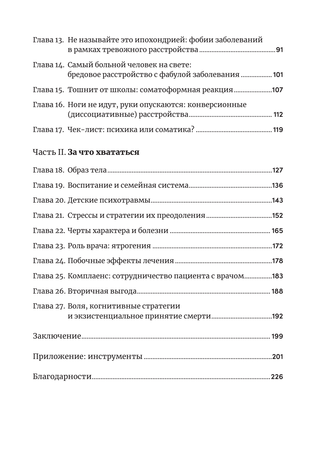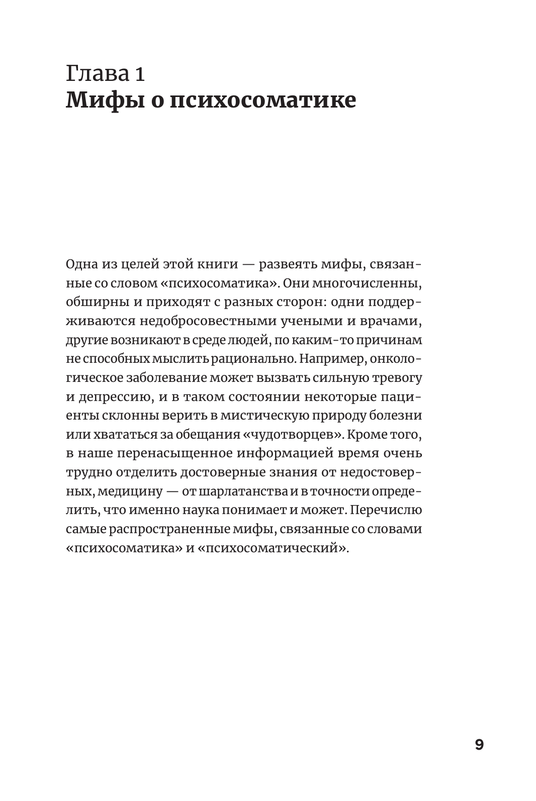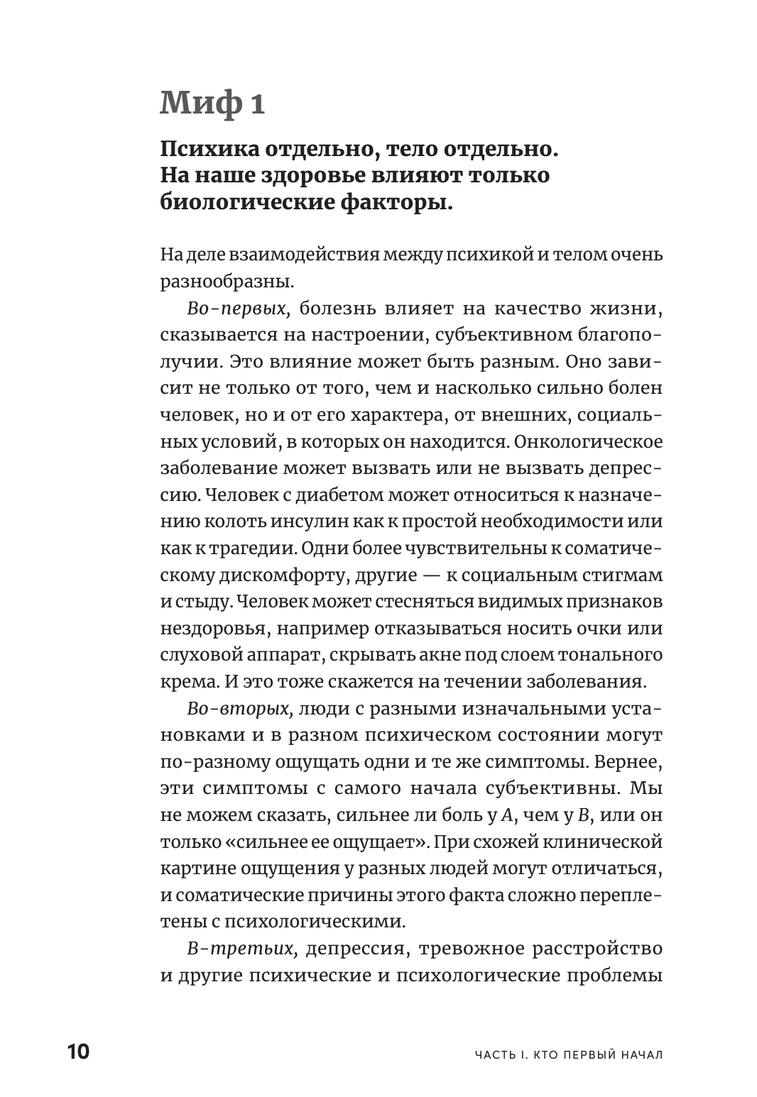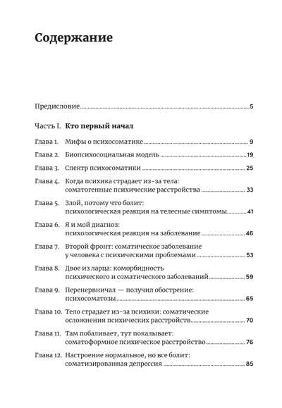 В этой книге Наталья Фомичева, психолог, специалист по психосоматическим расстройствам, автор книги «Близость», рассказывает о взаимосвязи телесного и психического и развенчивает мифы, которые окружают психосоматическую медицину. После ее прочтения вы узнаете, как связаны физические и психические заболевания, когда «первым начинает» тело, а когда — психика, и что делать, если проблема есть, а врачи ничего не находят.
