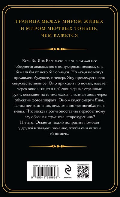 Если бы Яна Васильева знала, чем для нее обернется знакомство с популярным певцом, она бежала бы от него без оглядки. Но люди не могут предвидеть будущее, и теперь Яну преследует нечто сверхъестественное. Оно приходит по ночам, влезает через окно и тянет к ней свои черные страшные руки, оставляет на ее теле следы, видимые лишь через объектив фотоаппарата. Оно жаждет смерти Яны, в этом нет сомнения, ведь именно так погибла жена певца. Что может противопоставить первобытному злу обычная студентка-второкурсница? Ничего. Остается только попросить помощи у друзей и загадать желание, чтобы они успели ей помочь.