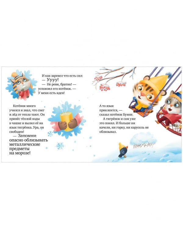 С книгой «Осторожно, зима!» вы подготовите ребенка к безопасности на прогулках зимой. Три поучительные сказки про игривого тигренка помогут узнать, где стоит быть осторожнее в это время года: