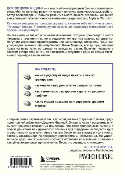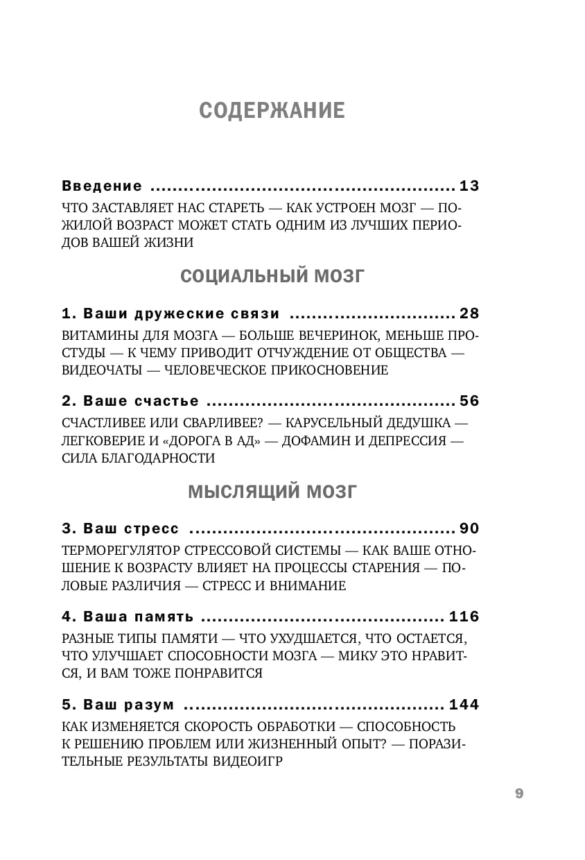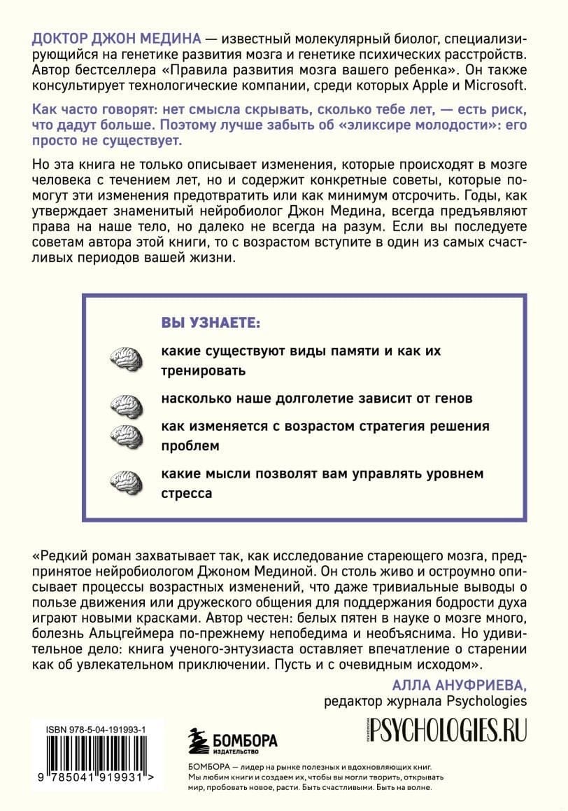 Эта книга описывает не только изменения мозга, происходящие с возрастом, но и способы, с помощью которых вы можете их предотвратить. В конце концов, возраст – просто выдумка скучных людей! А когда речь заходит о годах, оставленных за плечами, физический и умственный износ менее разрушителен, чем нежелание самого человека восстановить свои потери. Ослабление умственных способностей со временем не является неизбежным следствием прожитых лет. А если вы последуете советам из этой книги, ваш мозг останется пластичным, бодрым и готовым к восприятию нового в любом возрасте.