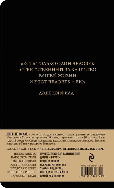 Серия "Путь лидера. Легендарные бестселлеры" - это семь наиболее значимых в своей области книг о влиянии, управлении, стойкости, внутренней силе, богатстве, решительности и упорстве. Все авторы - признанные лидеры или лучшие эксперты по ключевым навыкам лидера. Эти бестселлеры уже имеют свою историю успеха и помогли миллионам людей добиться выдающихся результатов. Джек Кэнфилд - ученик Наполеона Хилла, автор более 60 книг, разошедшихся по всему миру тиражами в 80 000 000 экземпляров, переведенных на 39 языков. Имя Джека Кэнфилда занесено в Книгу рекордов Гиннесса. "Правила успеха" - легендарная классика, которая помогла 500 000 читателей добиться успеха как в бизнесе, так и в личной жизни! Стратегия позитивного мышления поможет вам четче сформулировать, что именно вы хотите получить от жизни, и расскажет, как этого добиться. Книги серии "Путь лидера. Легендарные бестселлеры" роскошно оформлены: переплет из черного бумвинила, тиснение золотом, скругленные углы, стильные красные форзацы и лента-ляссе, качественная белая бумага в блоке. Прекрасный подарок и украшение книжной полки. Книга также выходит под названием "Правила (от соавтора проекта "Тайна")"