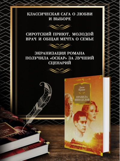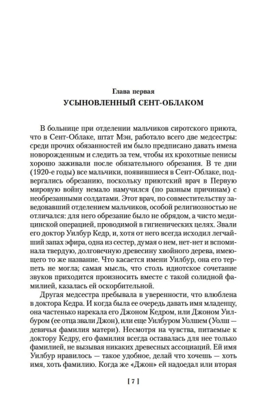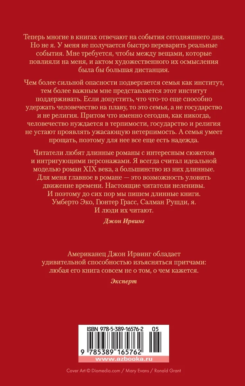 Классическая сага о любви и выборе от блистательного Джона Ирвинга, автора таких мировых бестселлеров, как «Мир глазами Гарпа» и «Отель «Нью-Гэмпшир»«, «Правила виноделов» и «Сын цирка», «Молитва об Оуэне Мини» и «Мужчины не ее жизни». Итак, молодой доктор приезжает в провинциальный городок работать в приюте для сирот. Он помогает женщинам этих сирот рожать, он воспитывает брошенных ими детей… Это книга о том, что каждый мечтает о семье, особенно сирота. Это книга о простых жизненных правилах, которых должны придерживаться люди, если они хотят оставаться людьми, об обязательствах, которые настоящие люди берут на себя и выполняют, и о призвании, которое, как ни крути, есть у каждого в жизни, но не всякий его найдет.