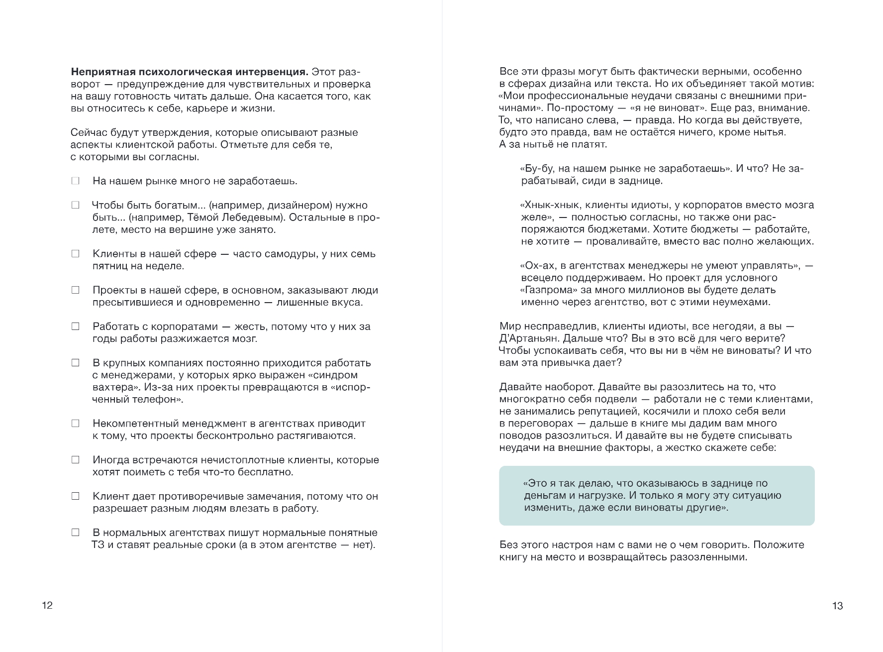 «Поиграйте со шрифтами», «сделайте вкусный текст», «логотип побольше» — знакомые фразы? А еще — бессонные ночи, неотвеченные сообщения от заказчика и «кидалы», которые не платят за сданный проект? Эта книга для всех, кто хочет работать по-другому.