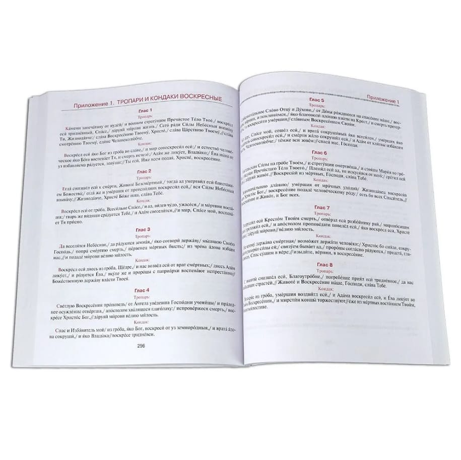 Календарь снабжен традиционными приложениями, в которых приведены тексты воскресных, общих, дневных тропарей и кондаков.