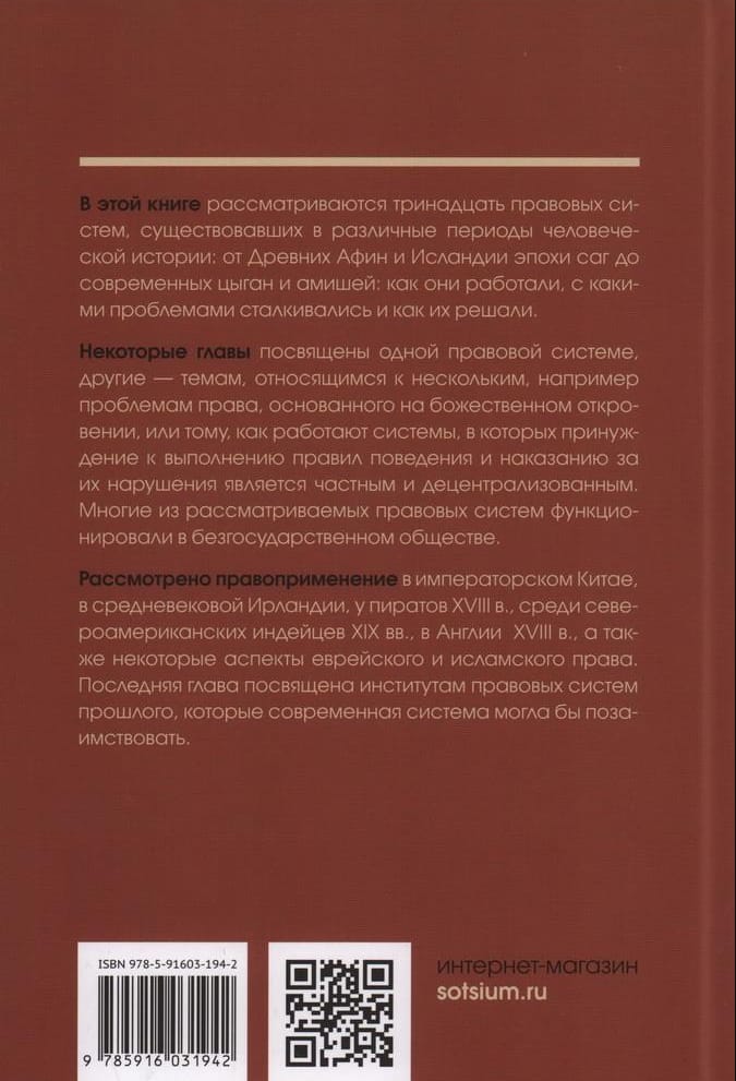 В этой книге рассматриваются тринадцать правовых систем, существовавших в различные периоды человеческой истории: от Древних Афин и Исландии эпохи саг до современных цыган и амишей: как они работали, с какими проблемами сталкивались и как их решали.