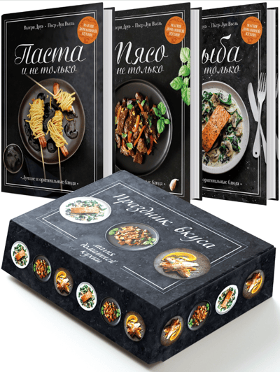Что может объединять мясо, пасту и рыбу? Конечно же подарочный набор «Праздник вкуса», куда вошли бестселлеры «Мясо», «Паста» и «Рыба», оформленные в одном стиле. Готовьте свои шедевры по лучшим рецептам!