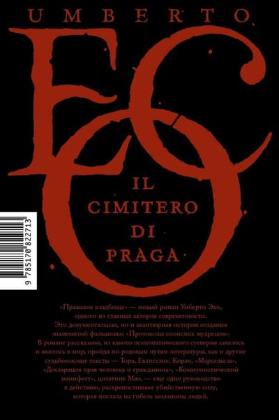 Действие романа "Пражское кладбище" разворачивается почти целиком во Франции, но последствия этой интриги трагически поразят потом целый мир. В центре собы­тий довольно скоро окажется* Россия, где в 1905 году была впервые напечатана зна­менитая литературная подделка "Протоколы сионских мудрецов". В романе докумен­тально рассказано,усилиями эта подделка была создана. Главный герой очень гадок, а все, что происходит с  ним, и ужасно, и интересно. Автор, строя сюжет в духе Александра Дюма, протаскивает затаившего дыхание читателя по зловонным париж­ским клоакам и по бандитским притонам, вербует героя в гарибальдийское войско, заставляет его шпионить на все разведки и контрразведки мира, в том числе и на рус­скую охранку, укрощать истеричек из клиники доктора Шарко, распивать пиво с Зиг­мундом Фрейдом, форсить бок о бок со Свободой на баррикадах и даже участвовать в сатанинской мессе. Одновременно, как всегда, Умберто Эко выдает читателю в обо­лочке приключенческого романа огромный заряд знаний и идей.