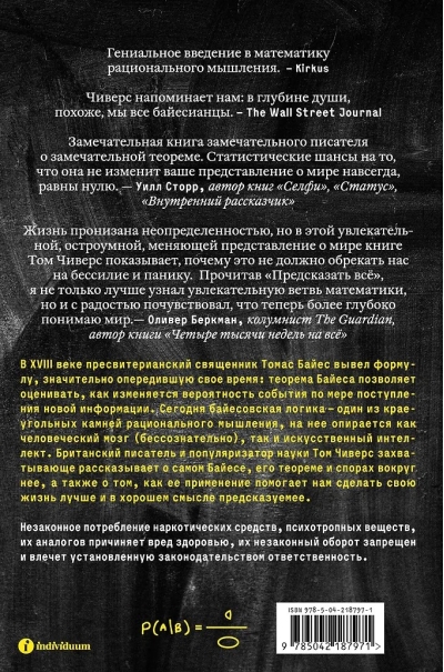 В XVIII веке пресвитерианский священник Томас Байес вывел формулу, значительно опередившую свое время: теорема Байеса позволяет оценивать, как изменяется вероятность события по мере поступления новой информации. Сегодня байесовская логика — один из краеугольных камней рационального мышления, на нее опирается как человеческий мозг (бессознательно), так и искусственный интеллект. Британский писатель и популяризатор науки Том Чиверс захватывающе рассказывает о самом Байесе, его теореме и спорах вокруг нее, а также о том, как ее применение помогает нам сделать свою жизнь лучше и в хорошем смысле предсказуемее.
