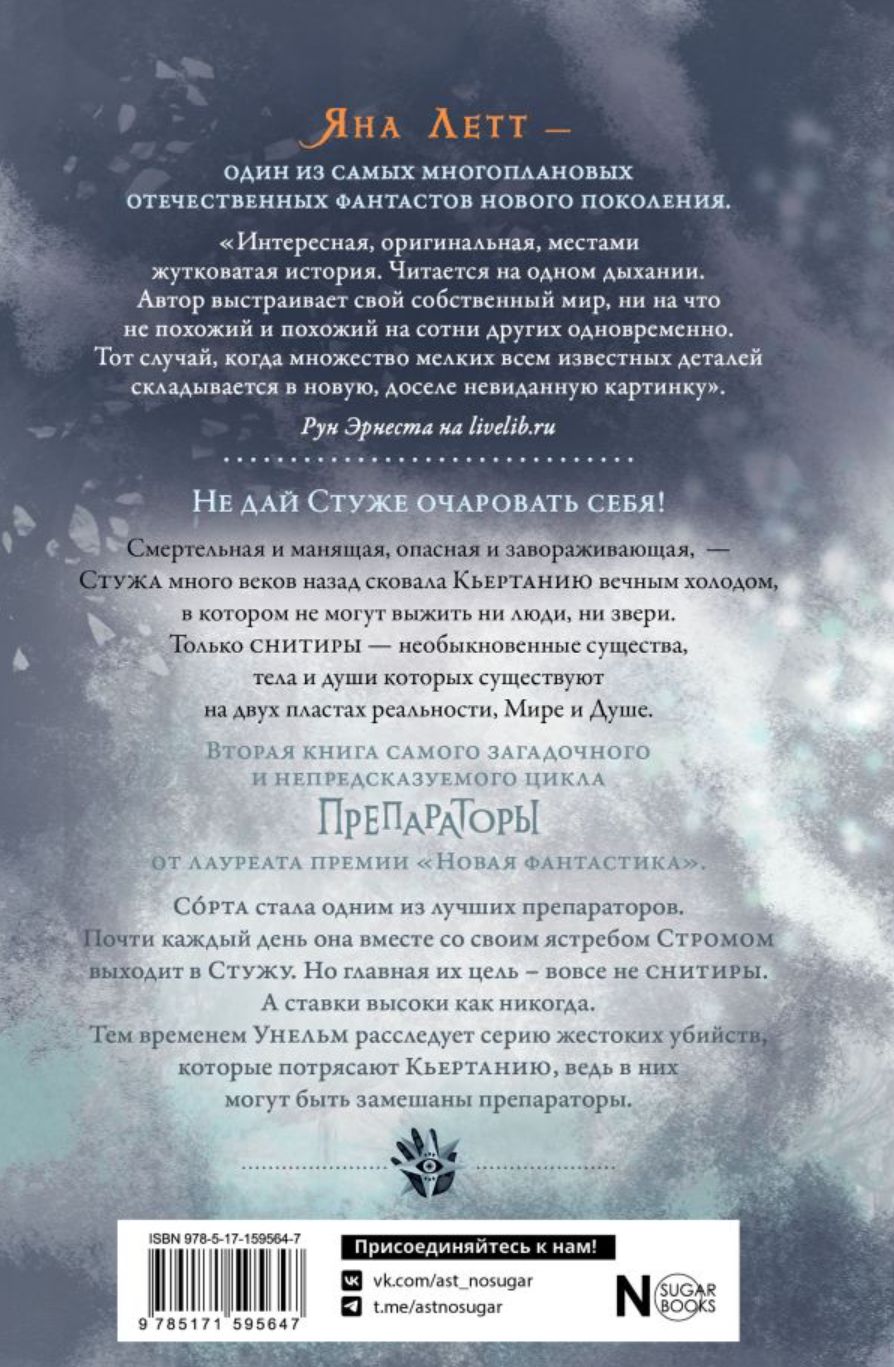 Сорта стала одним из лучших препараторов. Почти каждый день она вместе со своим ястребом, Стромом, выходит в Стужу. Но главная их цель – вовсе не снитиры. А ставки высоки, как никогда. Тем временем Унельм расследует серию жестоких убийств, которые потрясают Кьертанию - ведь в них могут быть замешаны препараторы. Вторая книга самого загадочного и непредсказуемого цикла «Препараторы» от лауреата премии «Новая фантастика».