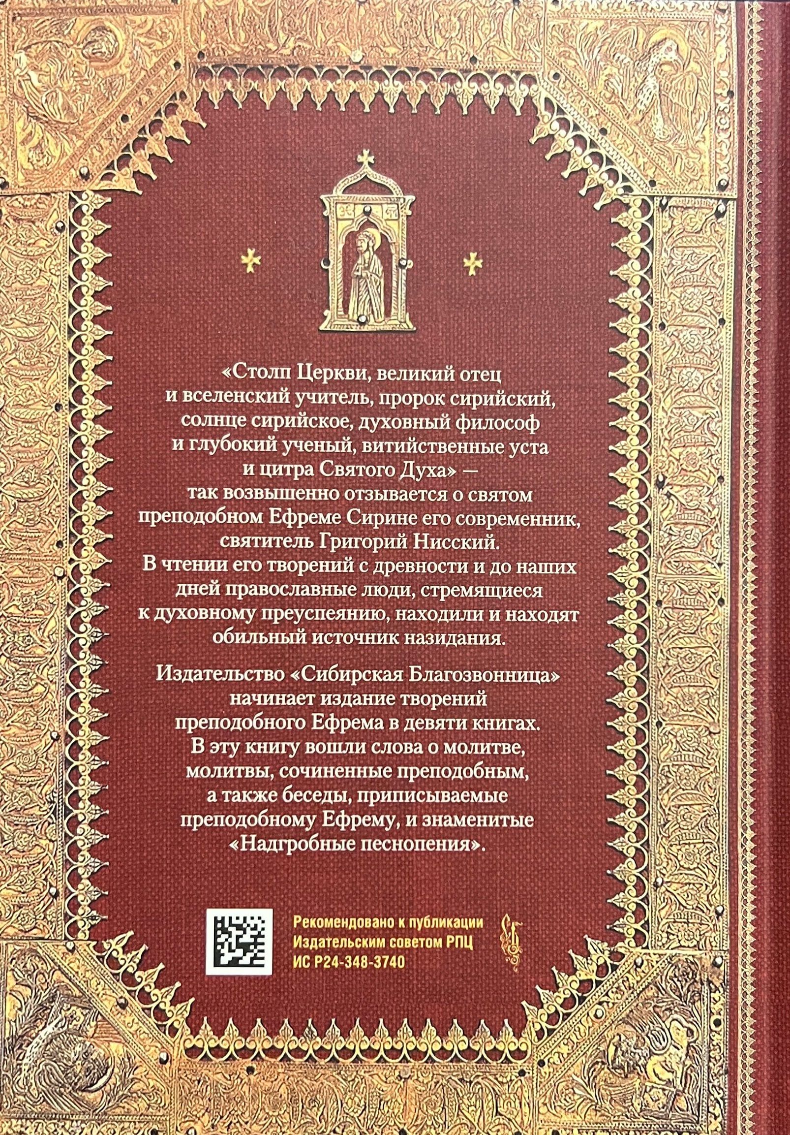 «Столп Церкви, великий отец и вселенский учитель, пророк сирийский, солнце сирийское, духовный философ и глубокий ученый, витийственные уста и цитра Святого Духа» — так возвышенно отзывается о святом преподобном Ефреме Сирине его современник, святитель Григорий Нисский. В чтении его творений с древности и до наших дней православные люди, стремящиеся к духовному преуспеянию, находили и находят обильный источник назидания. Издательство «Сибирская Благозвонница» начинает издание творений преподобного Ефрема. В данную книгу вошли слова о молитве, молитвы, сочиненные преподобным, а также беседы, приписываемые преподобному Ефрему, и знаменитые «Надгробные песнопения».