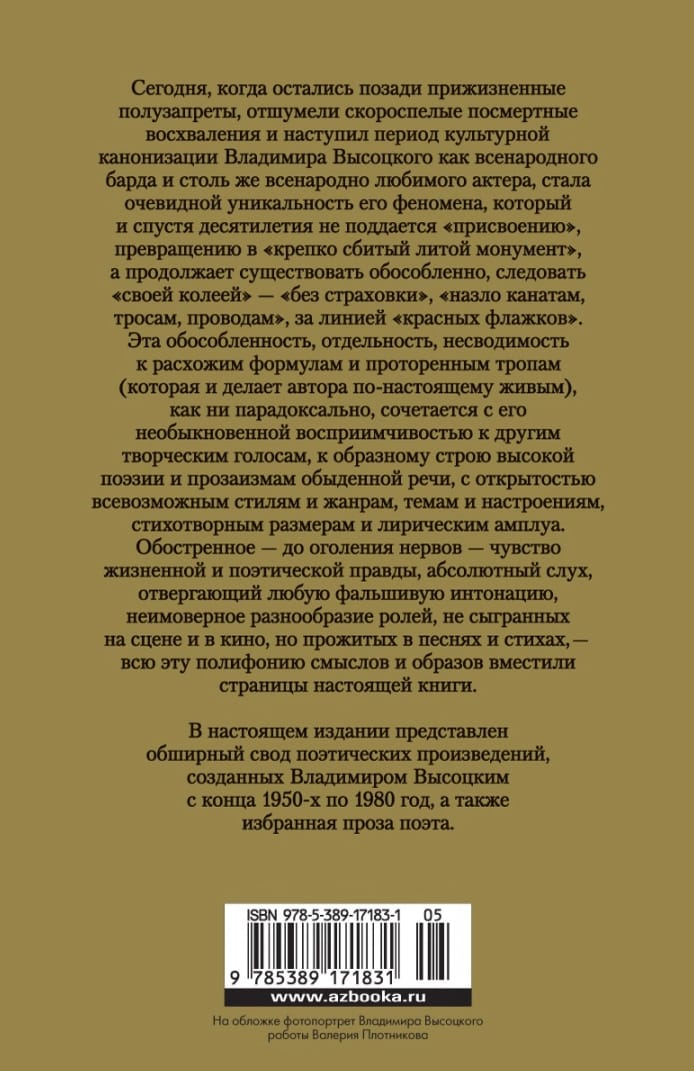 Сегодня, когда остались позади прижизненные полузапреты, отшумели скороспелые посмертные восхваления и наступил период культурной канонизации Владимира Высоцкого как всенародного барда и столь же всенародно любимого актера, стала очевидной уникальность его феномена, который и спустя десятилетия не поддается «присвоению», превращению в «крепко сбитый литой монумент», а продолжает существовать обособленно, следовать «своей колеей» – «без страховки», «назло канатам, тросам, проводам», за линией «красных флажков». Эта обособленность, отдельность, несводимость к расхожим формулам и проторенным тропам (которая и делает автора по-настоящему живым), как ни парадоксально, сочетается с его необыкновенной восприимчивостью к другим творческим голосам, к образному строю высокой поэзии и прозаизмам обыденной речи, с открытостью всевозможным стилям и жанрам, темам и настроениям, стихотворным размерам и лирическим амплуа. Обостренное – до оголения нервов – чувство жизненной и поэтической правды, абсолютный слух, отвергающий любую фальшивую интонацию, неимоверное разнообразие ролей, не сыгранных на сцене и в кино, но прожитых в песнях и стихах, – всю эту полифонию смыслов и образов вместили страницы настоящей книги. В настоящем издании представлен обширный свод поэтических произведений, созданных Владимиром Высоцким с конца 1950-х по 1980 год, а также избранная проза поэта.