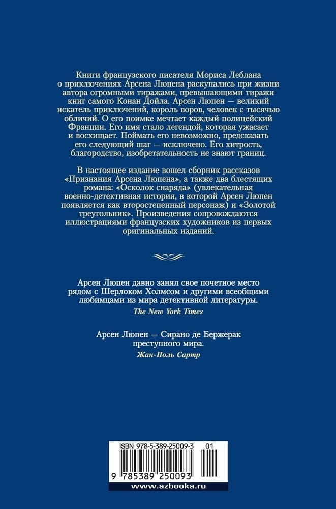 Книги французского писателя Мориса Леблана о приключениях Арсена Люпена раскупались при жизни автора огромными тиражами, превышающими тиражи книг самого Конан Дойла. Арсен Люпен — великий искатель приключений, король воров, человек с тысячью обличий. О его поимке мечтает каждый полицейский Франции. Его имя стало легендой, которая ужасает и восхищает. Поймать его невозможно, предсказать его следующий шаг — исключено. Его хитрость, благородство, изобретательность не знают границ. В настоящее издание вошел сборник рассказов «Признания Арсена Люпена», а также два романа: «Осколок снаряда» (увлекательная военно-детективная история, в которой Арсен Люпен появляется как второстепенный персонаж) и «Золотой треугольник». Произведения сопровождаются иллюстрациями французских художников из первых оригинальных изданий.
