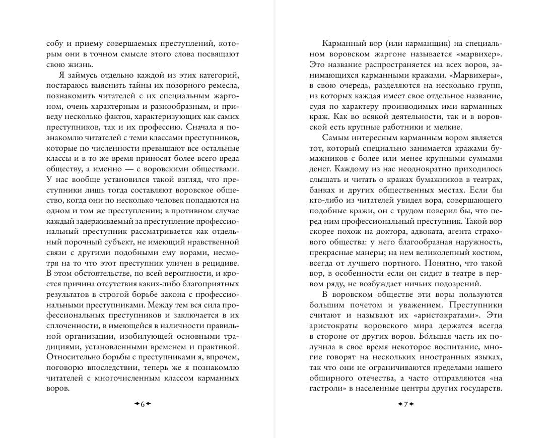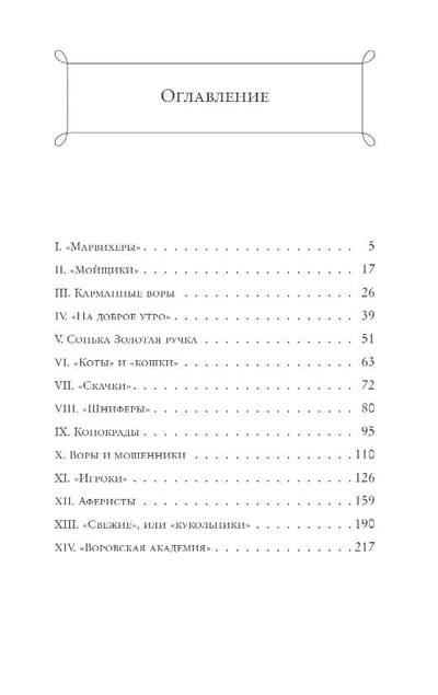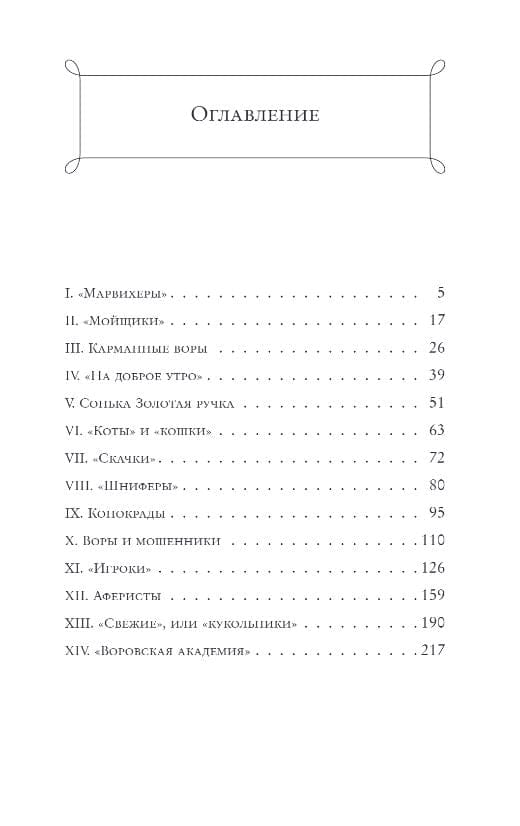 Книга детально исследует методы работы профессиональных преступников: от карманников («марвихеров») и взломщиков («скокарей») до мошенников и конокрадов. Автор раскрывает воровские «профессии», их жаргон, техники и даже своеобразную «этику». Особое внимание уделено легендарным фигурам, таким как Сонька Золотая Ручка, чьи аферы вошли в криминальный фольклор.