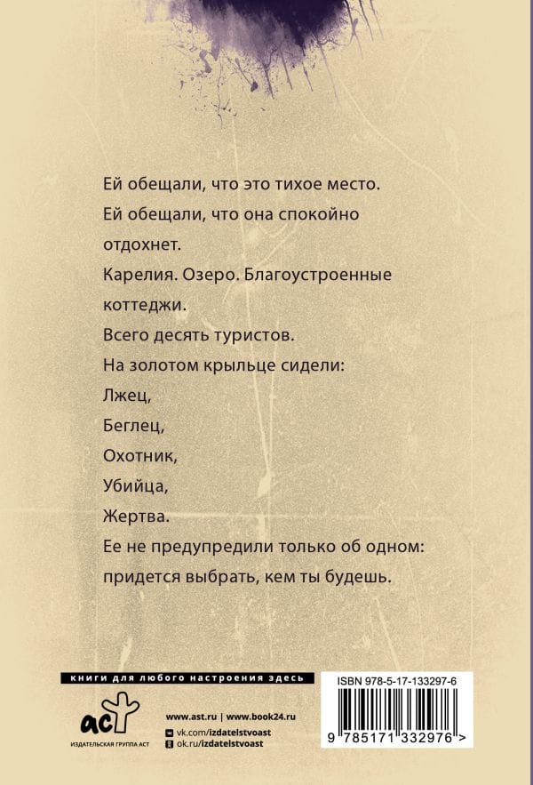 Ей обещали, что это тихое место. Ей обещали, что она спокойно отдохнет. Карелия. Озеро. Благоустроенные коттеджи. Всего десять туристов. На золотом крыльце сидели: Лжец, Беглец, Охотник, Убийца, Жертва. Ее не предупредили только об одном: придется выбрать, кем ты будешь.